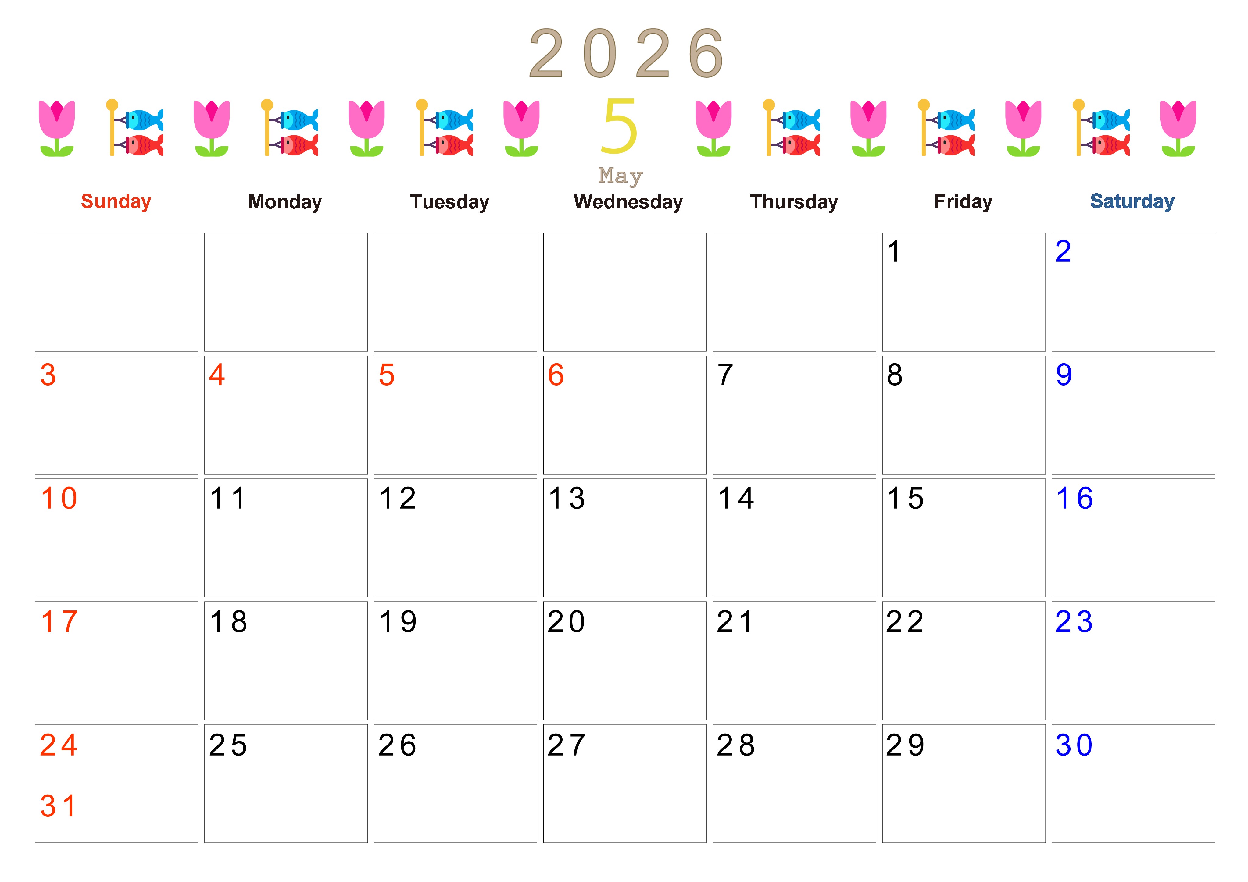 2026年5月カレンダーは横型日曜始まりで季節感あふれる行事のカラフルなイラストがおしゃれ:無料(2026-01370500)