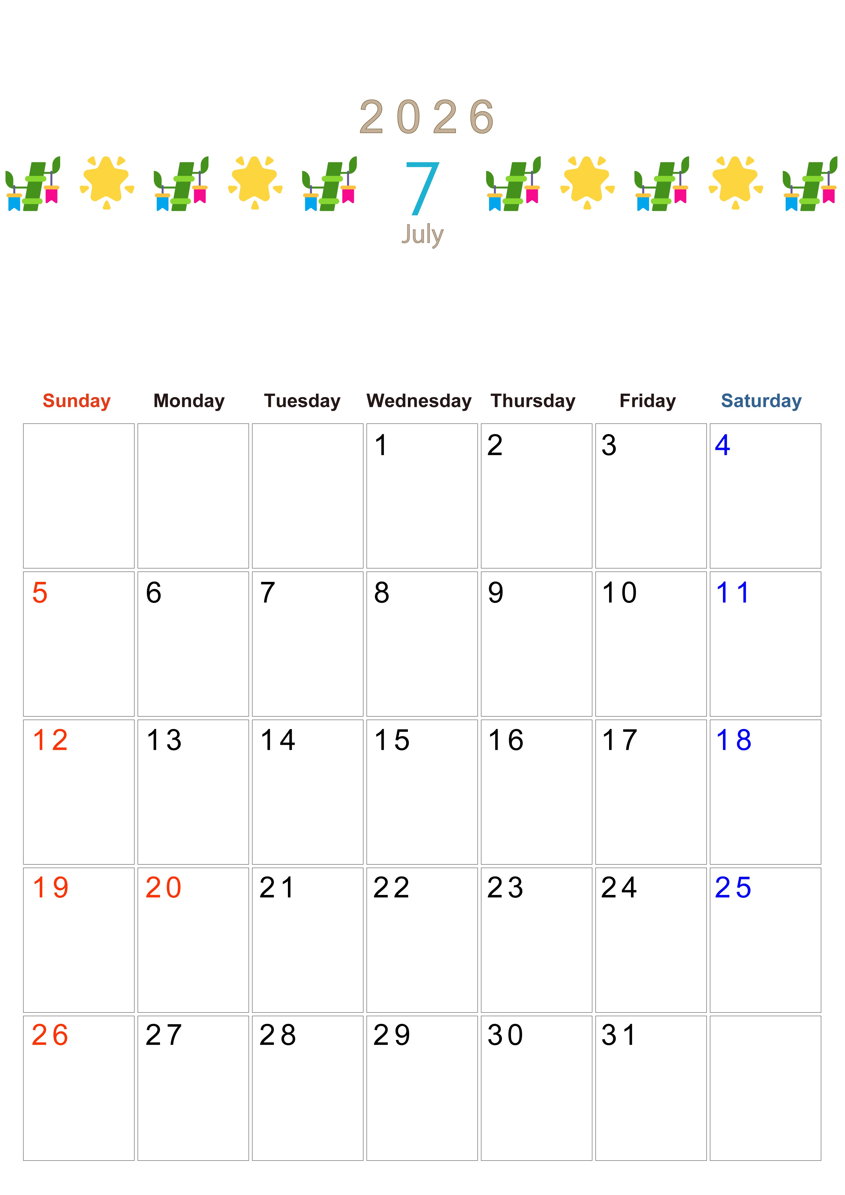 2026年7月カレンダーは縦型日曜始まりで季節感のある行事のカラフルな絵文字イラストがおしゃれです。無料でダウンロードをして季節に合ったイラストをお楽しみください。(2026-01370710)