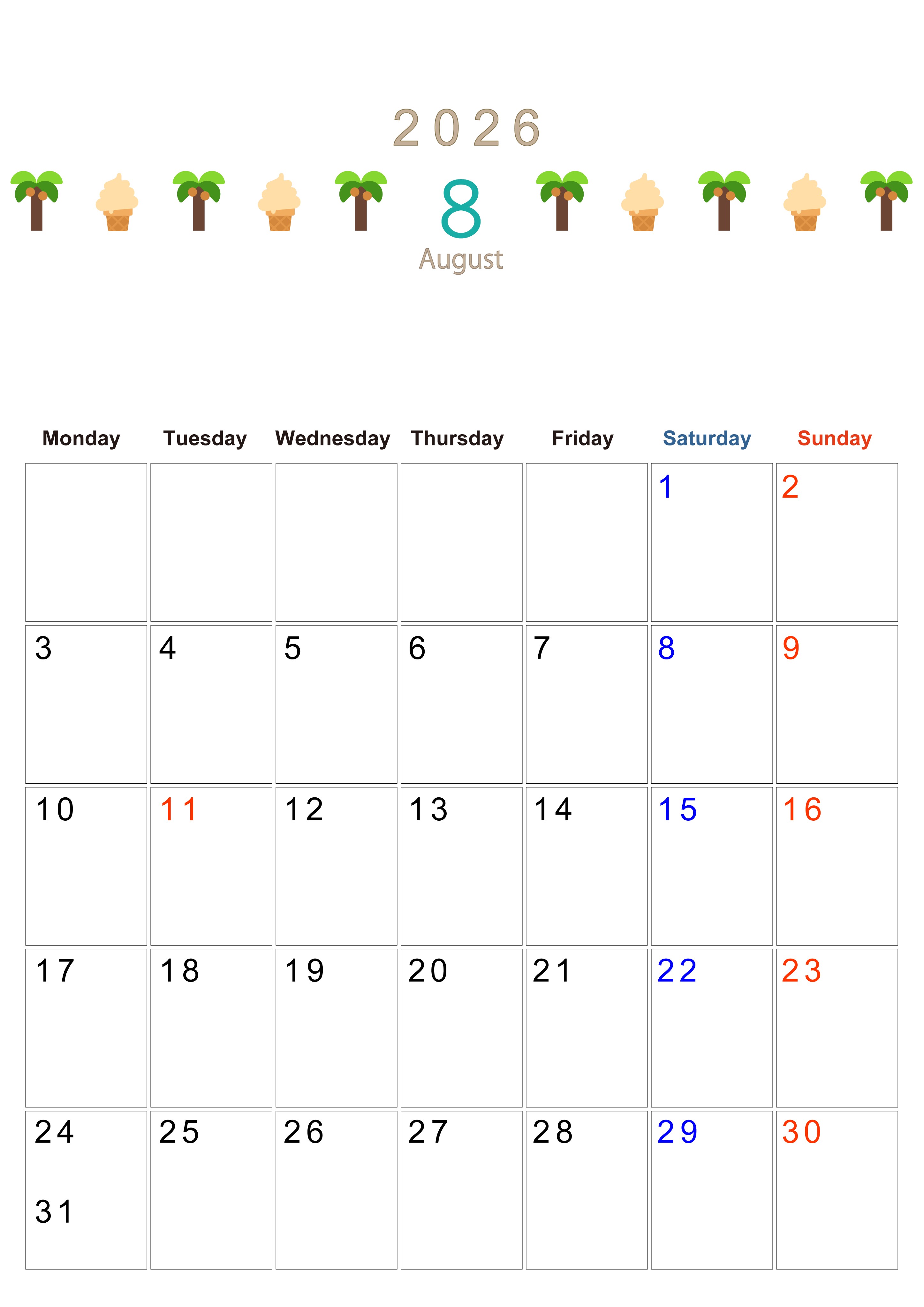 2026年8月カレンダーは縦型月曜始まりで季節感のある行事のカラフルな絵文字イラストがおしゃれです。無料でダウンロードをして季節に合ったイラストをお楽しみください。(2026-01370811)