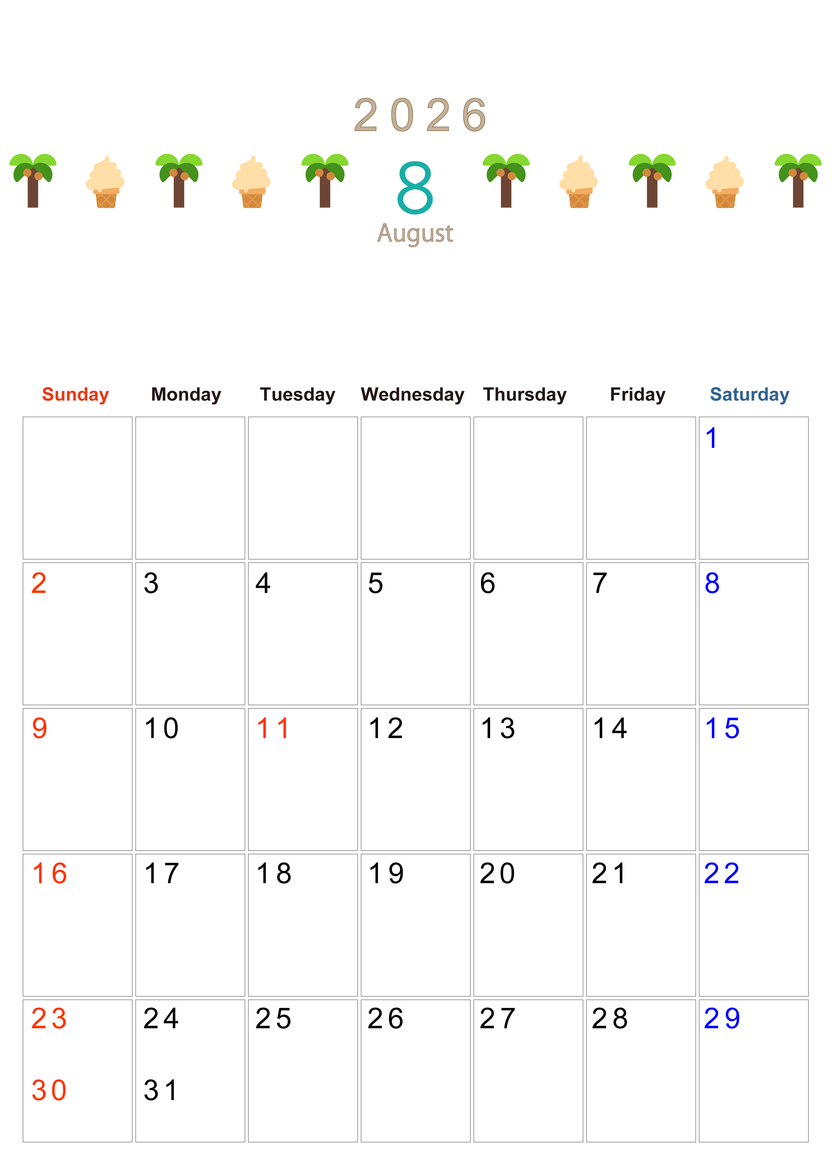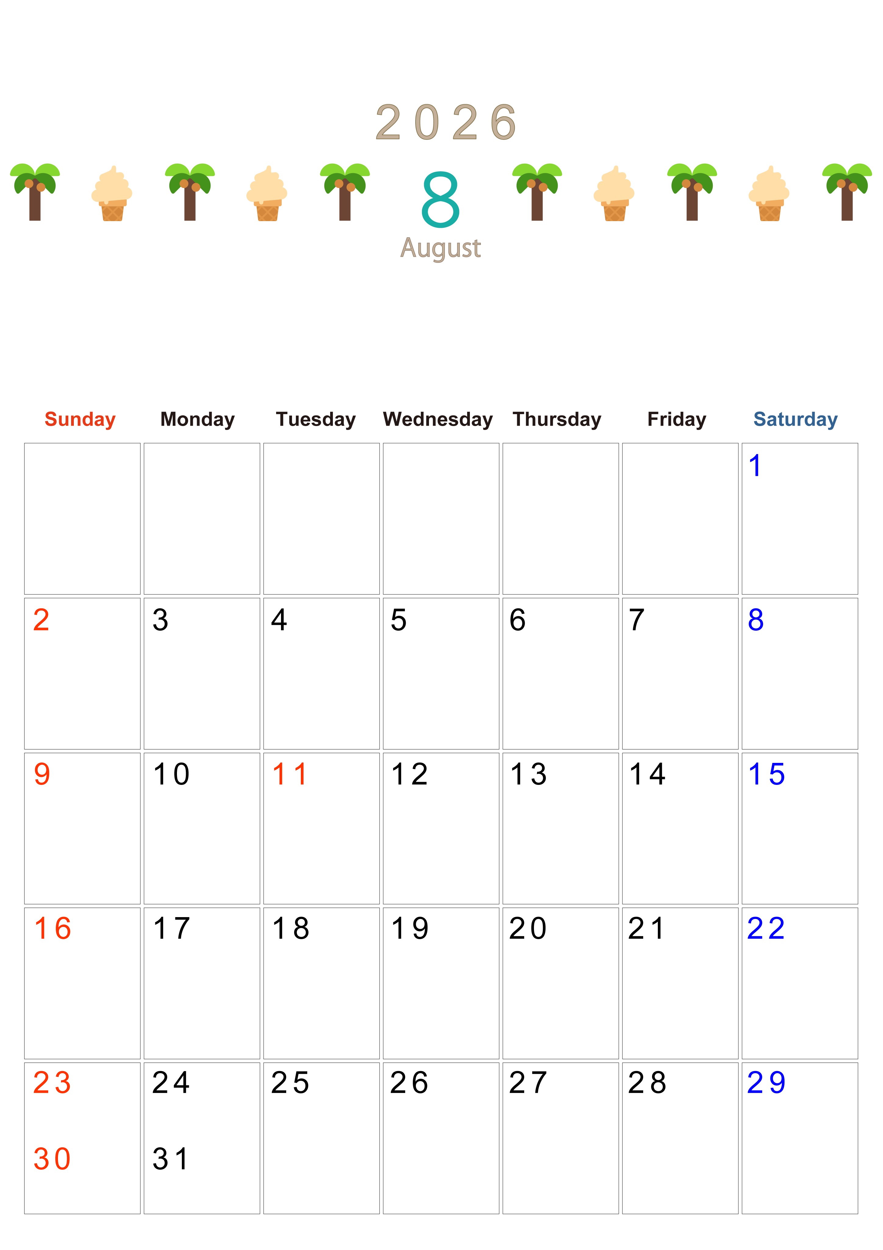 2026年・無料のカレンダーテンプレート 2026年8月カレンダーは縦型日曜始まりで季節感あふれる行事のカラフルなイラストがおしゃれ:無料(2026-01370810) 素材状デザイン王 2025年4月11日 2026年8月カレンダーは縦型日曜始まりで季節感のある行事のカラフルな絵文字イラストがおしゃれです。無料でダウンロードをして季節に合ったイラストをお楽しみください。(2026-01370810) おしゃれ 8月 季節 縦型のカレンダー 日曜始まり カレンダーデザイン-0137
