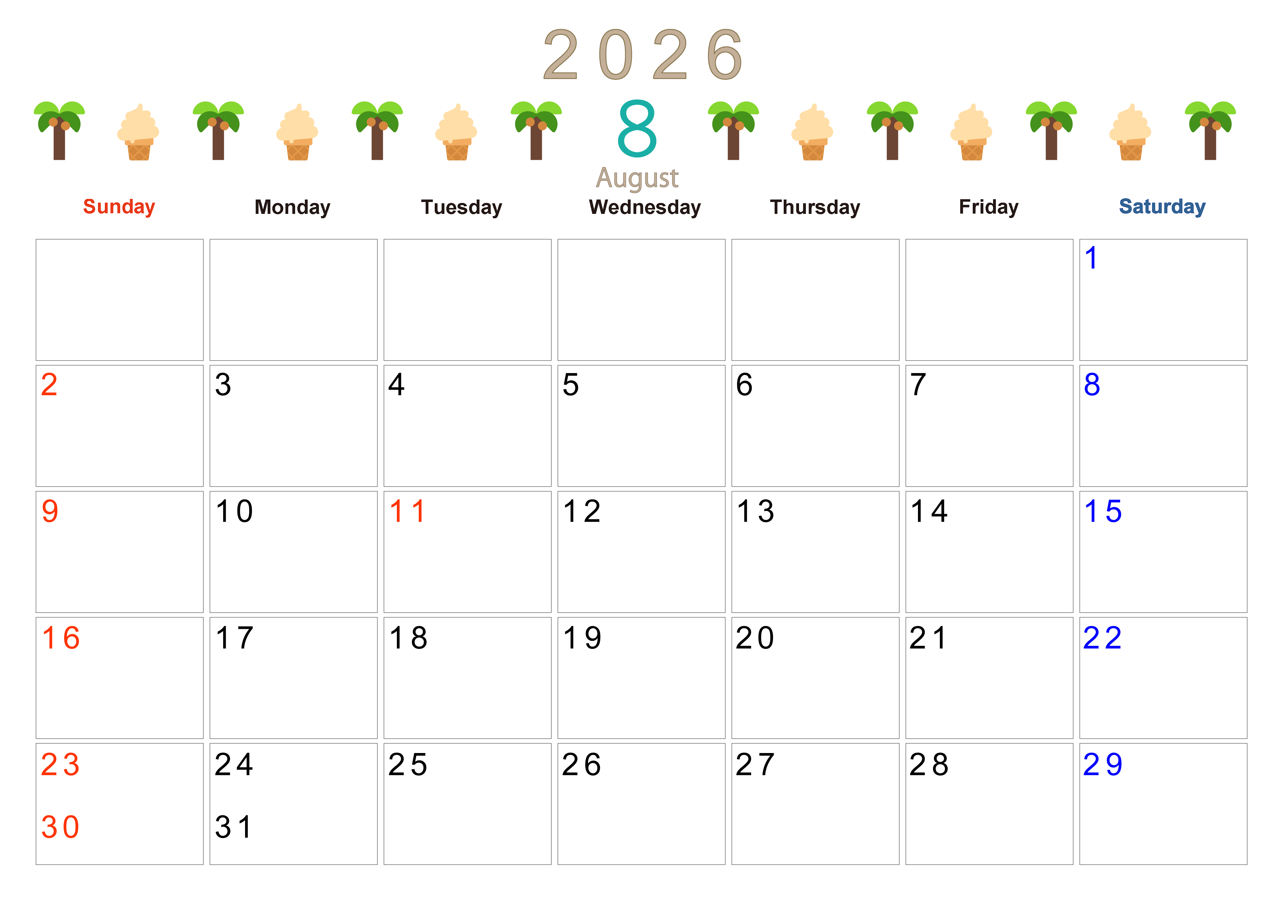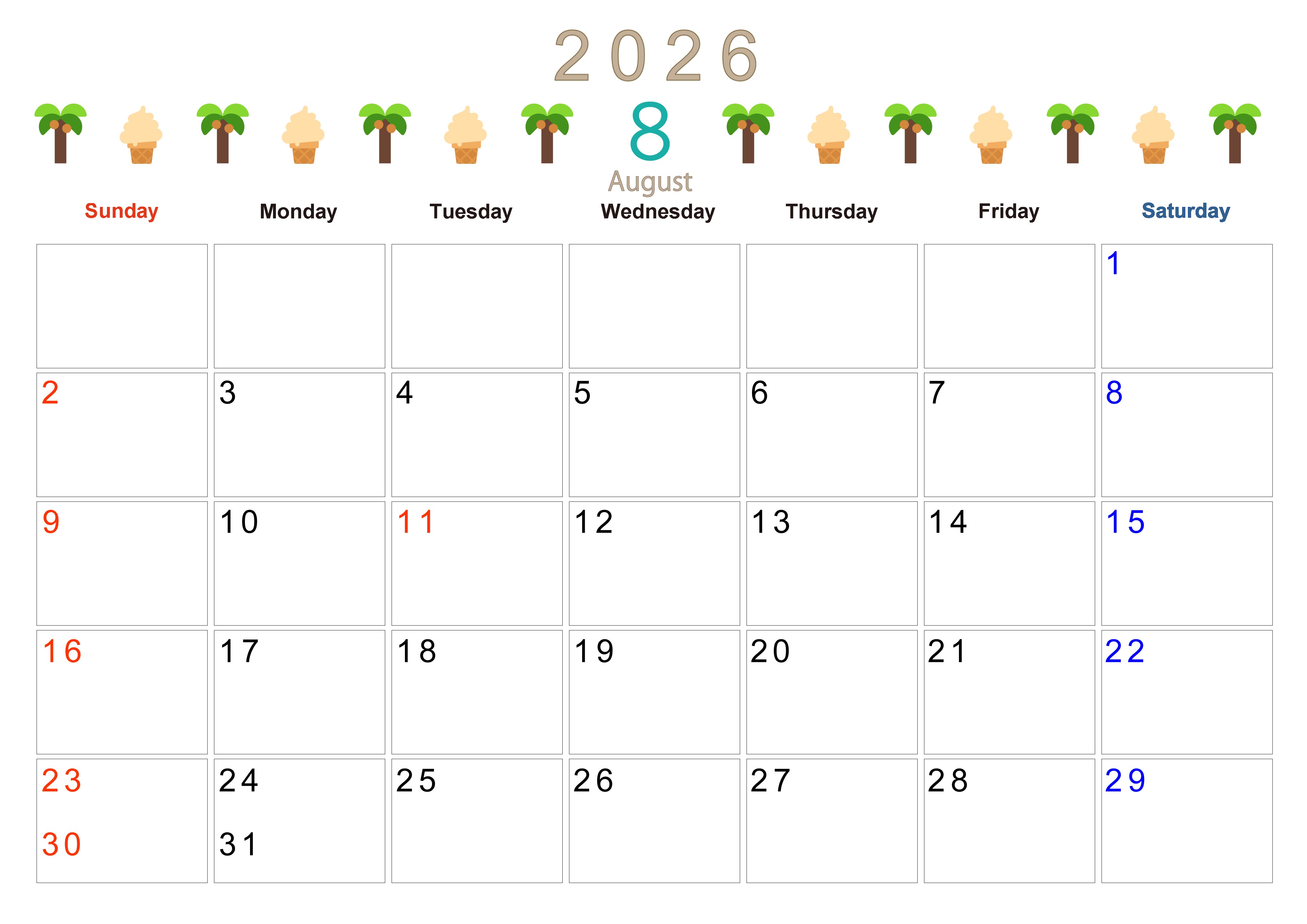 2026年8月カレンダーは横型日曜始まりで季節感あふれる行事のカラフルなイラストがおしゃれ:無料(2026-01370800)