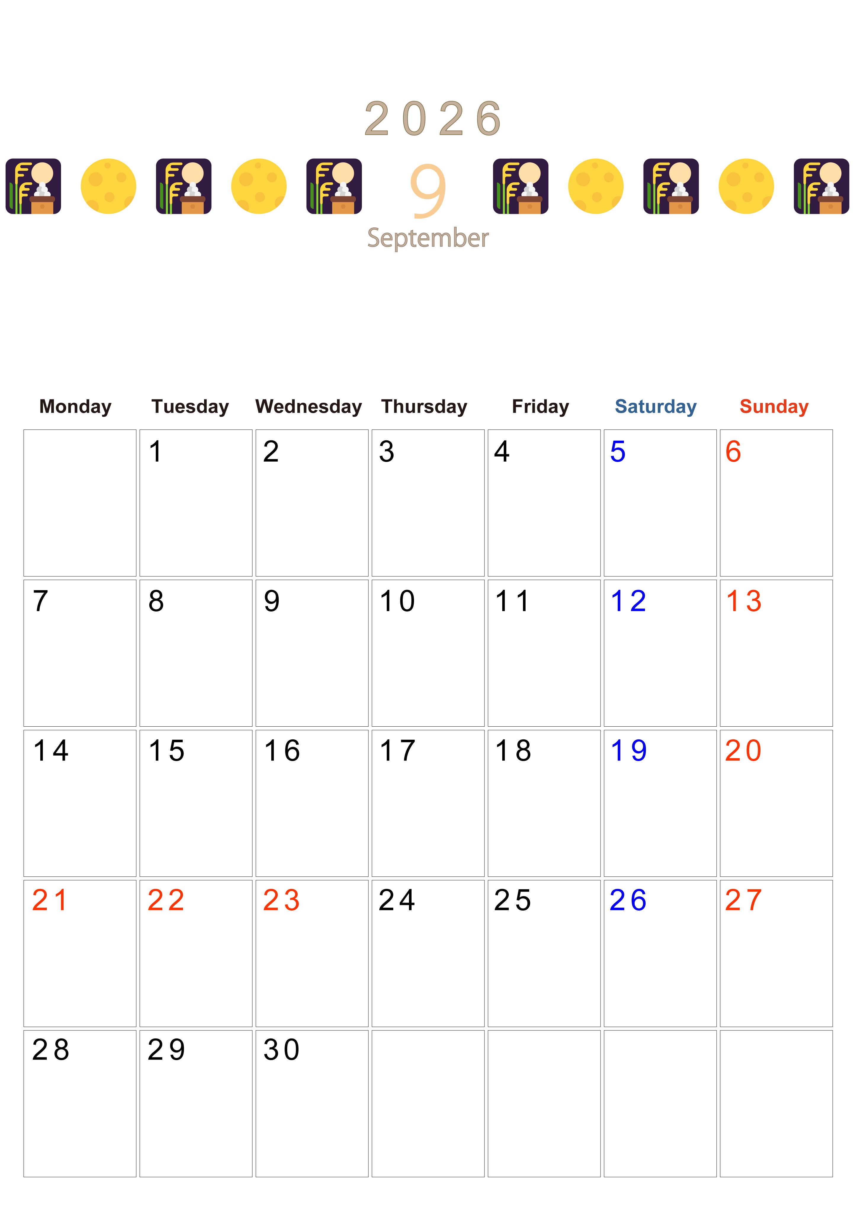 2026年9月カレンダーは縦型月曜始まりで季節感あふれる行事のカラフルなイラストがおしゃれ:無料(2026-01370911)