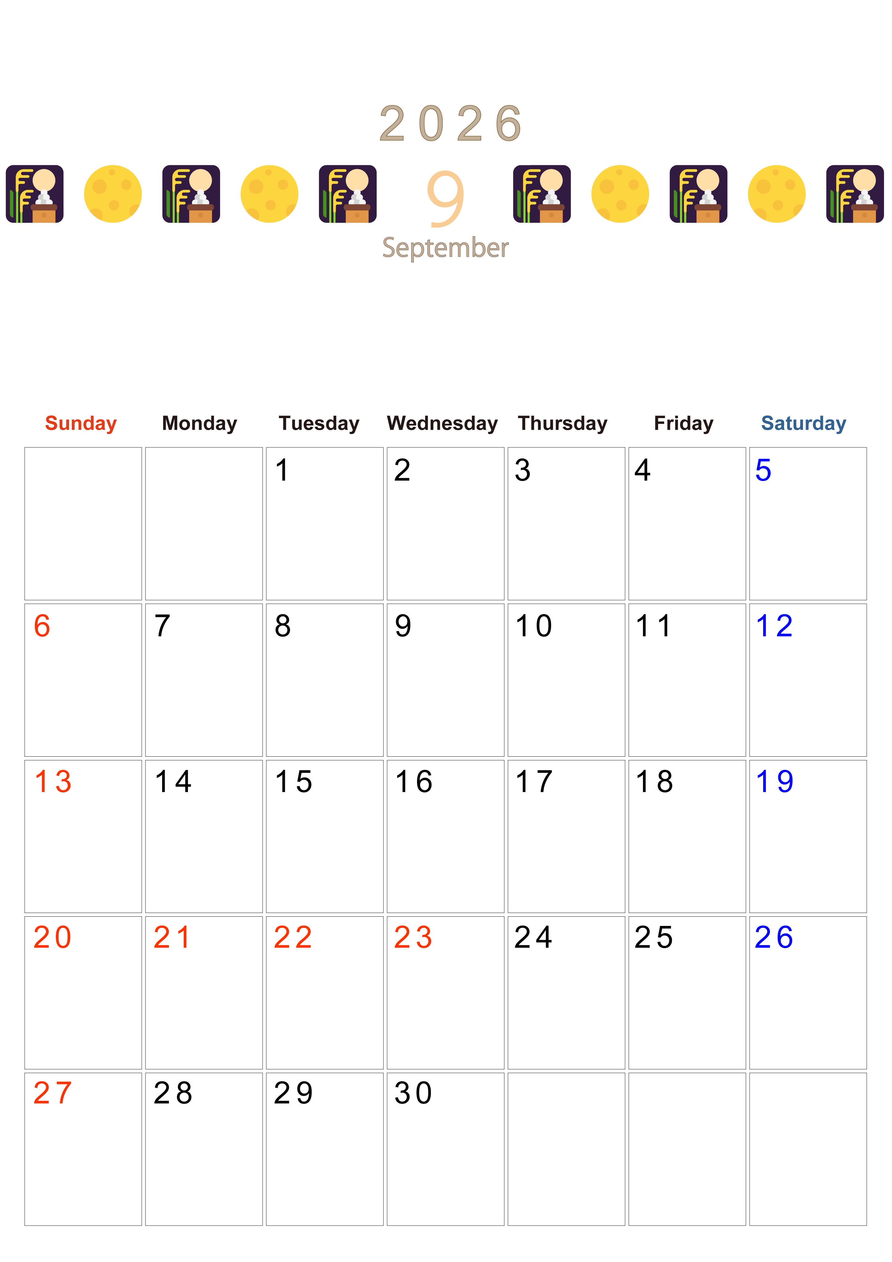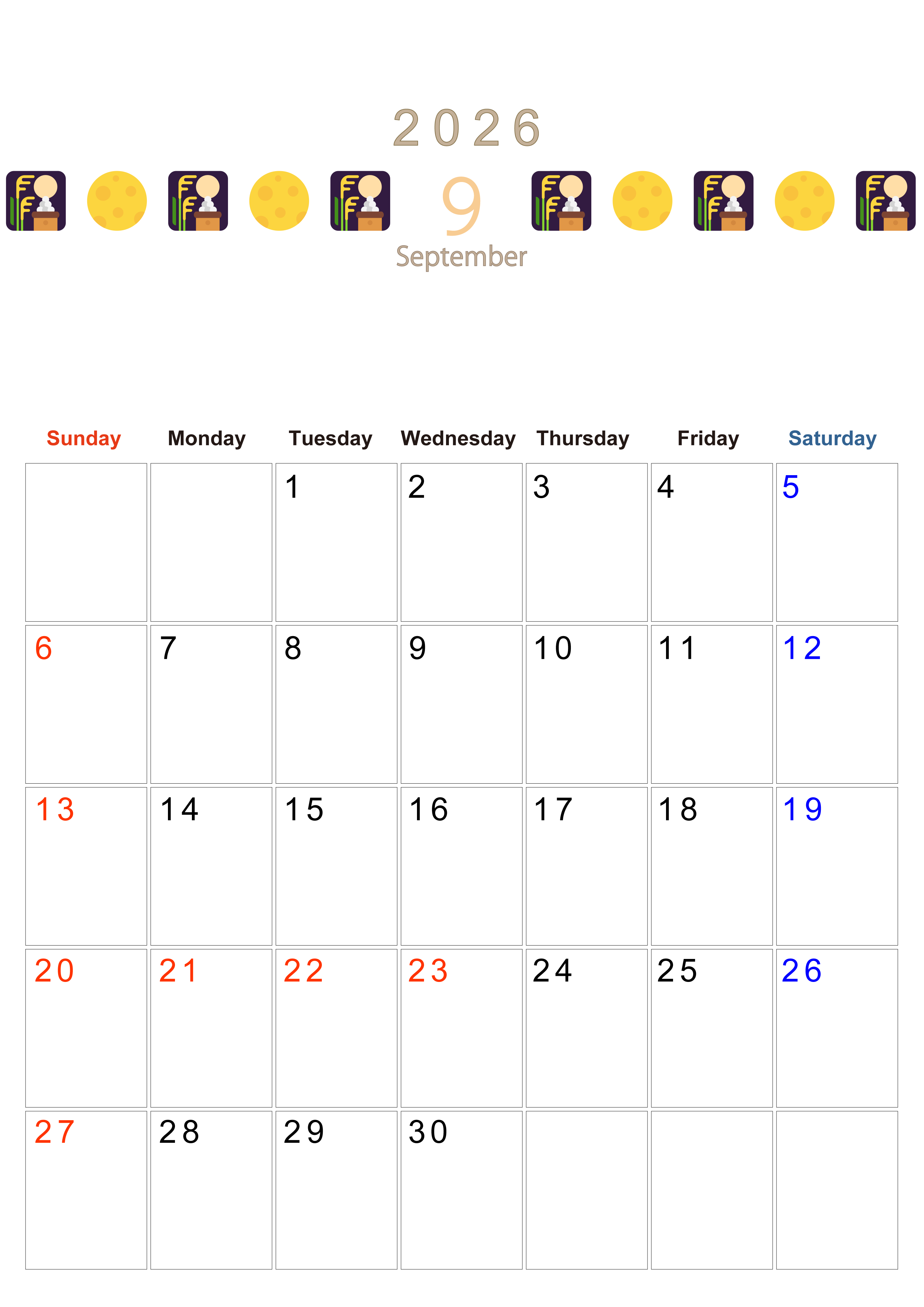 2026年・無料のカレンダーテンプレート 2026年9月カレンダーは縦型日曜始まりで季節感あふれる行事のカラフルなイラストがおしゃれ:無料(2026-01370910) 素材状デザイン王 2025年4月11日 2026年9月カレンダーは縦型日曜始まりで季節感のある行事のカラフルな絵文字イラストがおしゃれです。無料でダウンロードをして季節に合ったイラストをお楽しみください。(2026-01370910) おしゃれ 9月 季節 縦型のカレンダー 日曜始まり カレンダーデザイン-0137