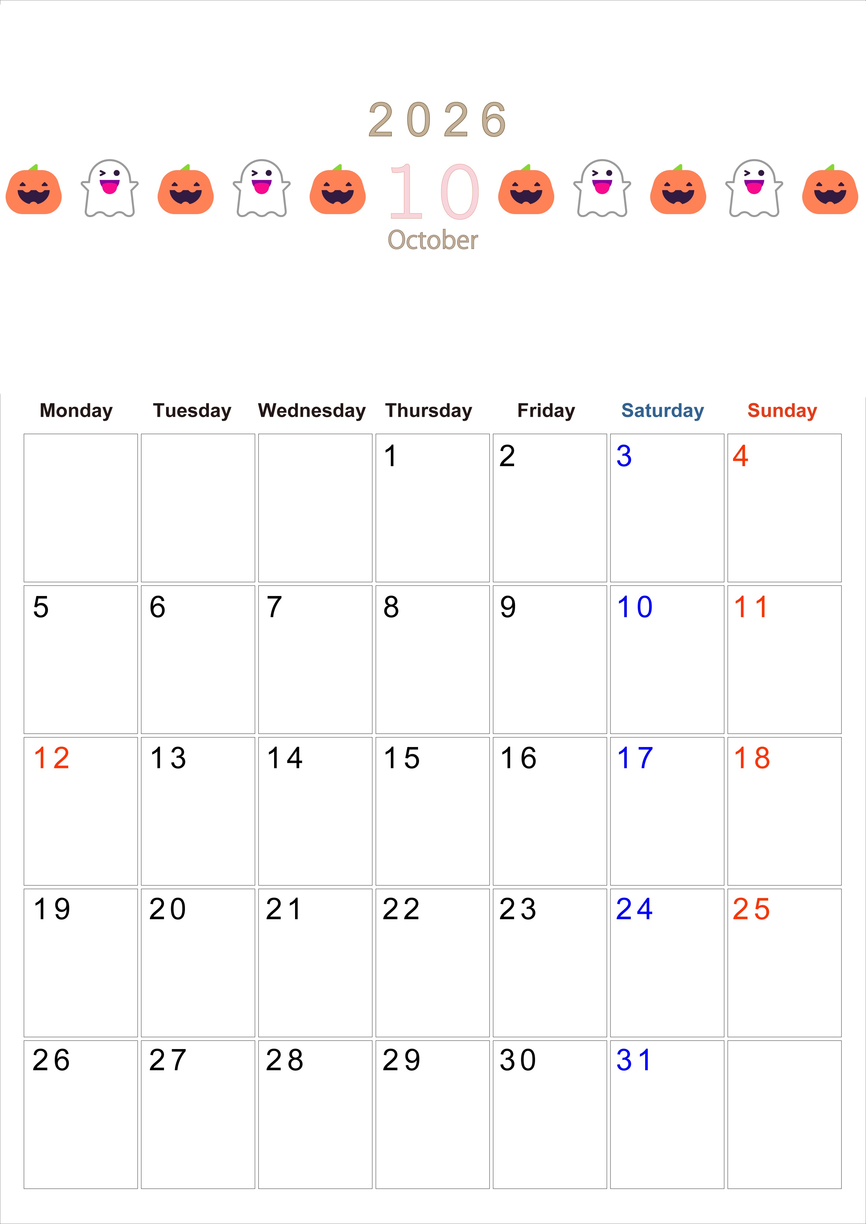 2026年10月カレンダーは縦型月曜始まりで季節感のある行事のカラフルな絵文字イラストがおしゃれです。無料でダウンロードをして季節に合ったイラストをお楽しみください。(2026-01371011)