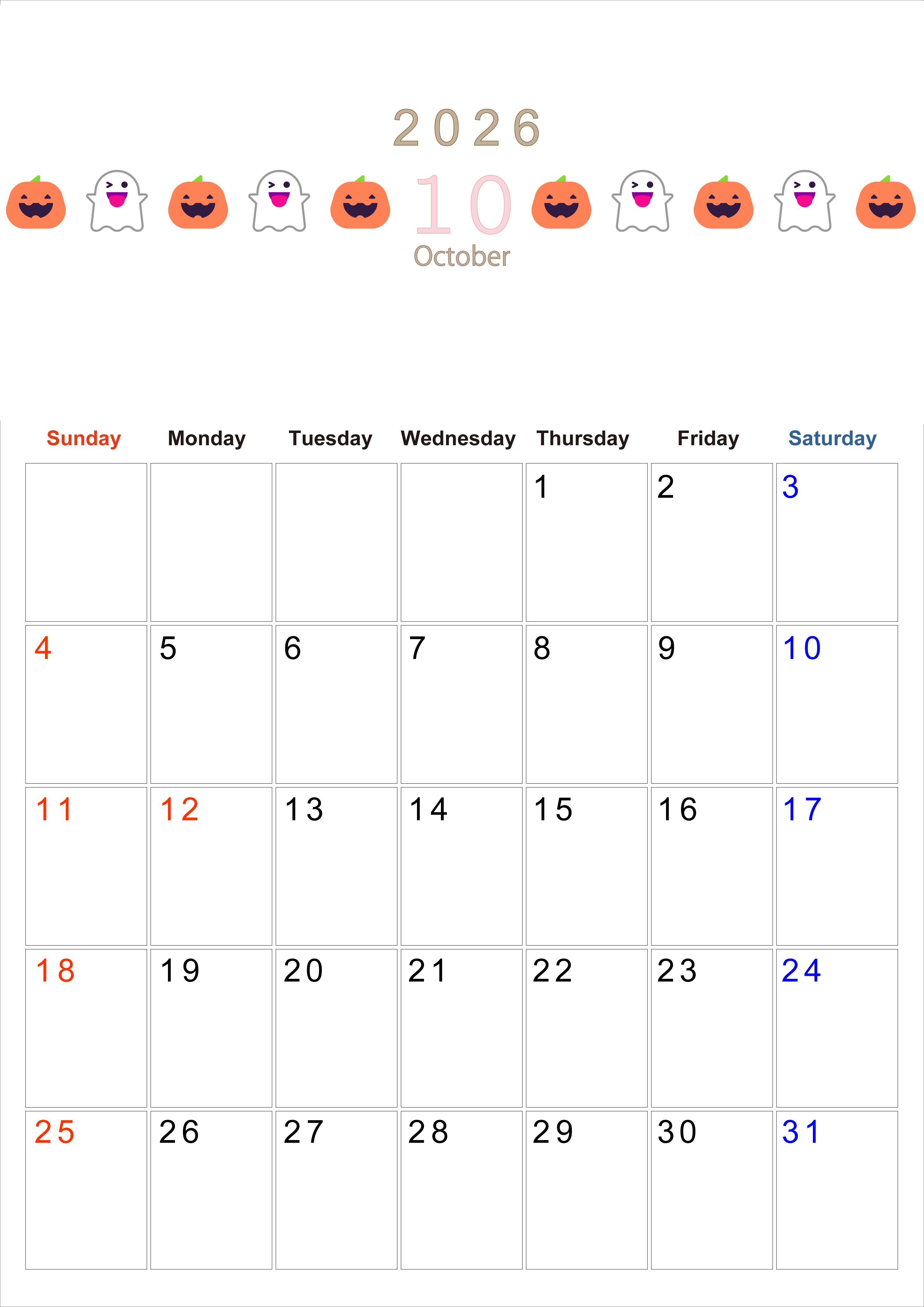 2026年10月カレンダーは縦型日曜始まりで季節感のある行事のカラフルな絵文字イラストがおしゃれです。無料でダウンロードをして季節に合ったイラストをお楽しみください。(2026-01371010)