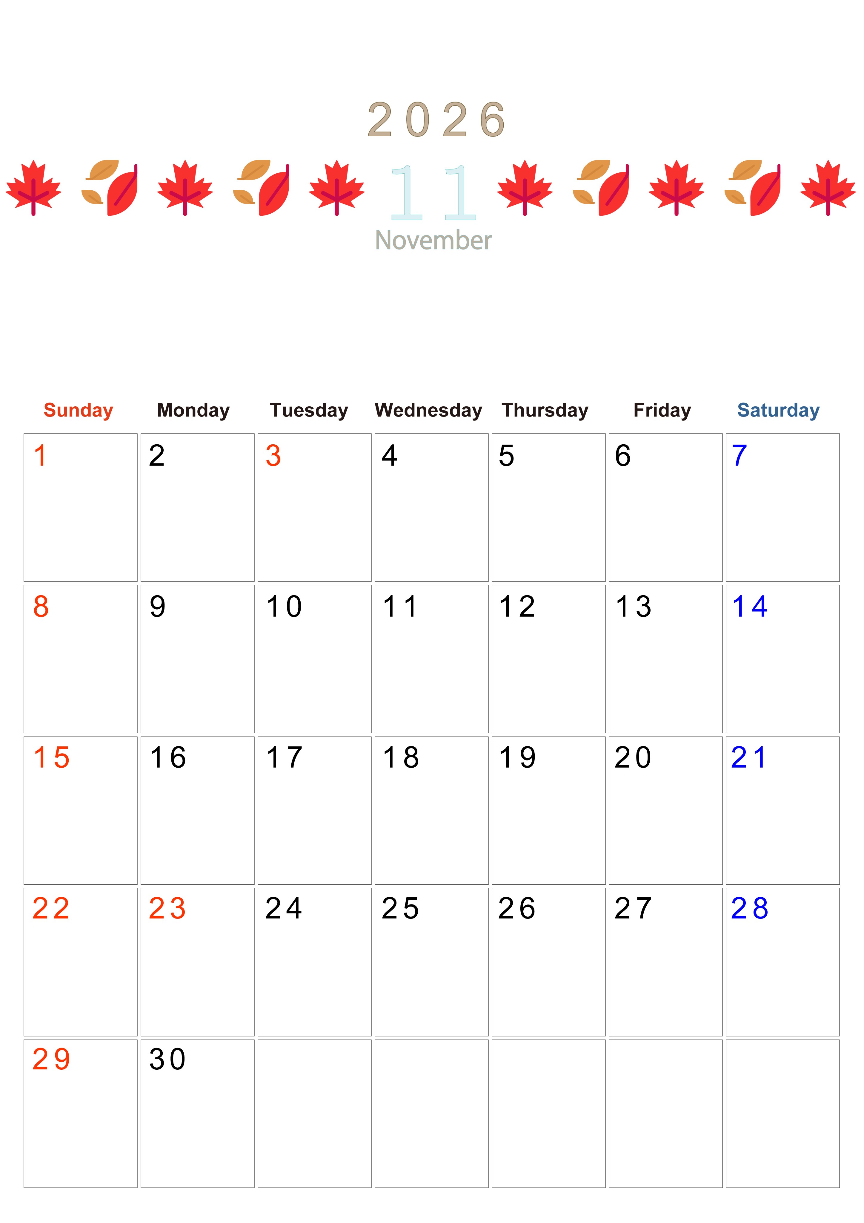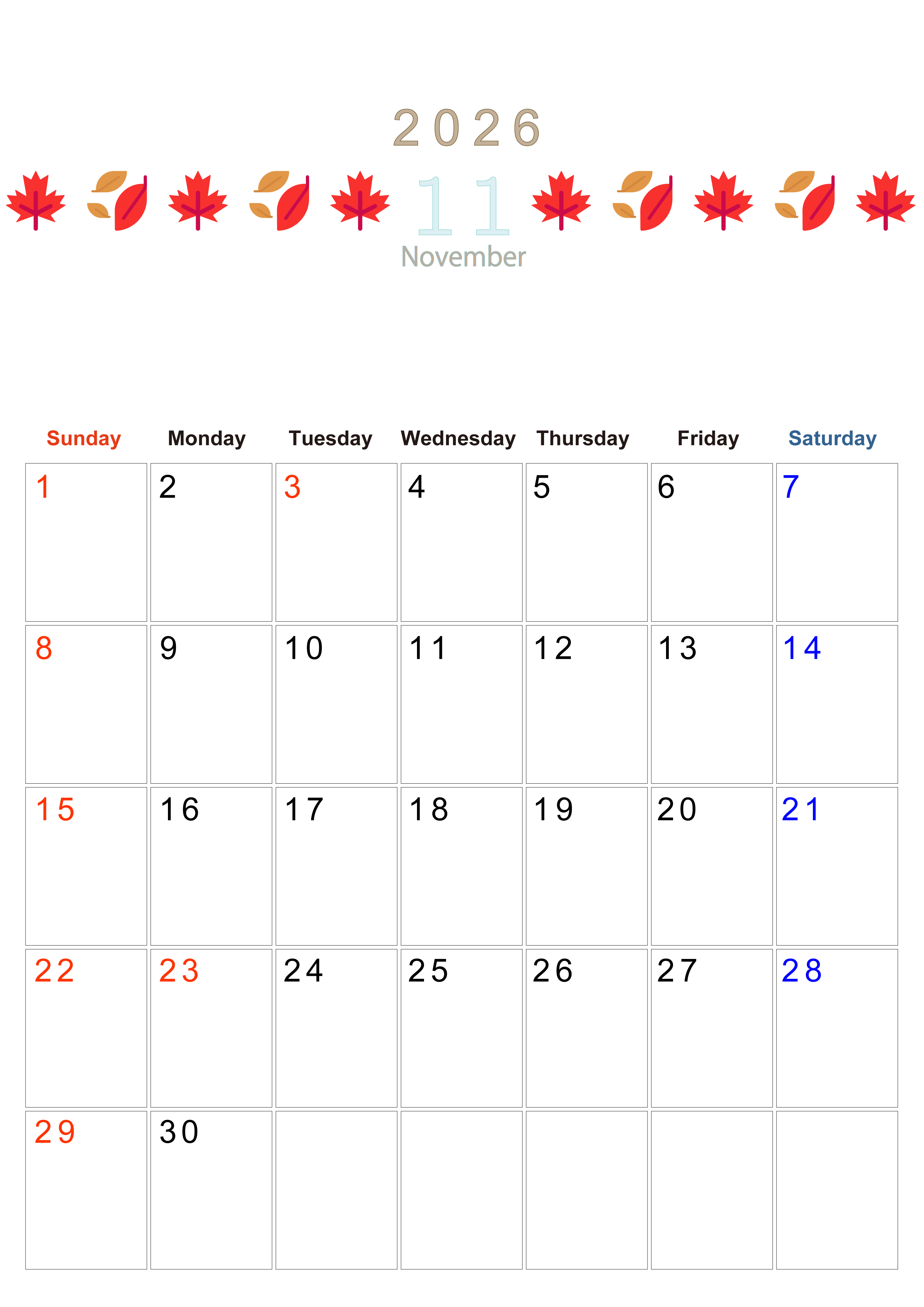 2026年11月カレンダーは縦型日曜始まりで季節感あふれる行事のカラフルなイラストがおしゃれ:無料(2026-01371110)