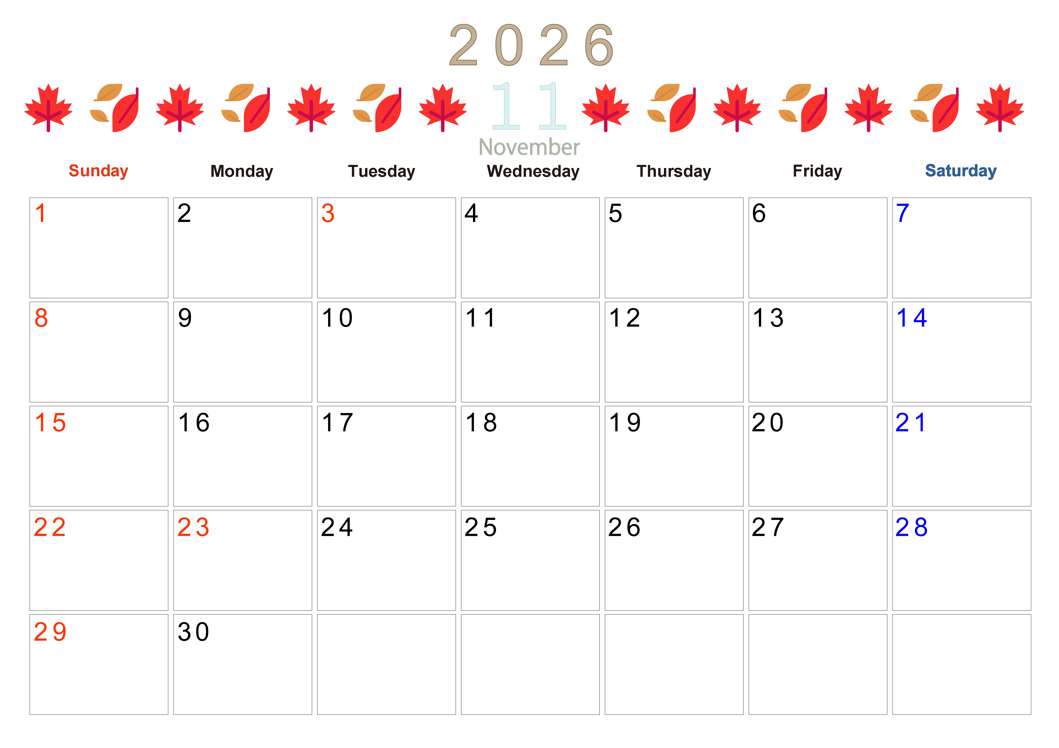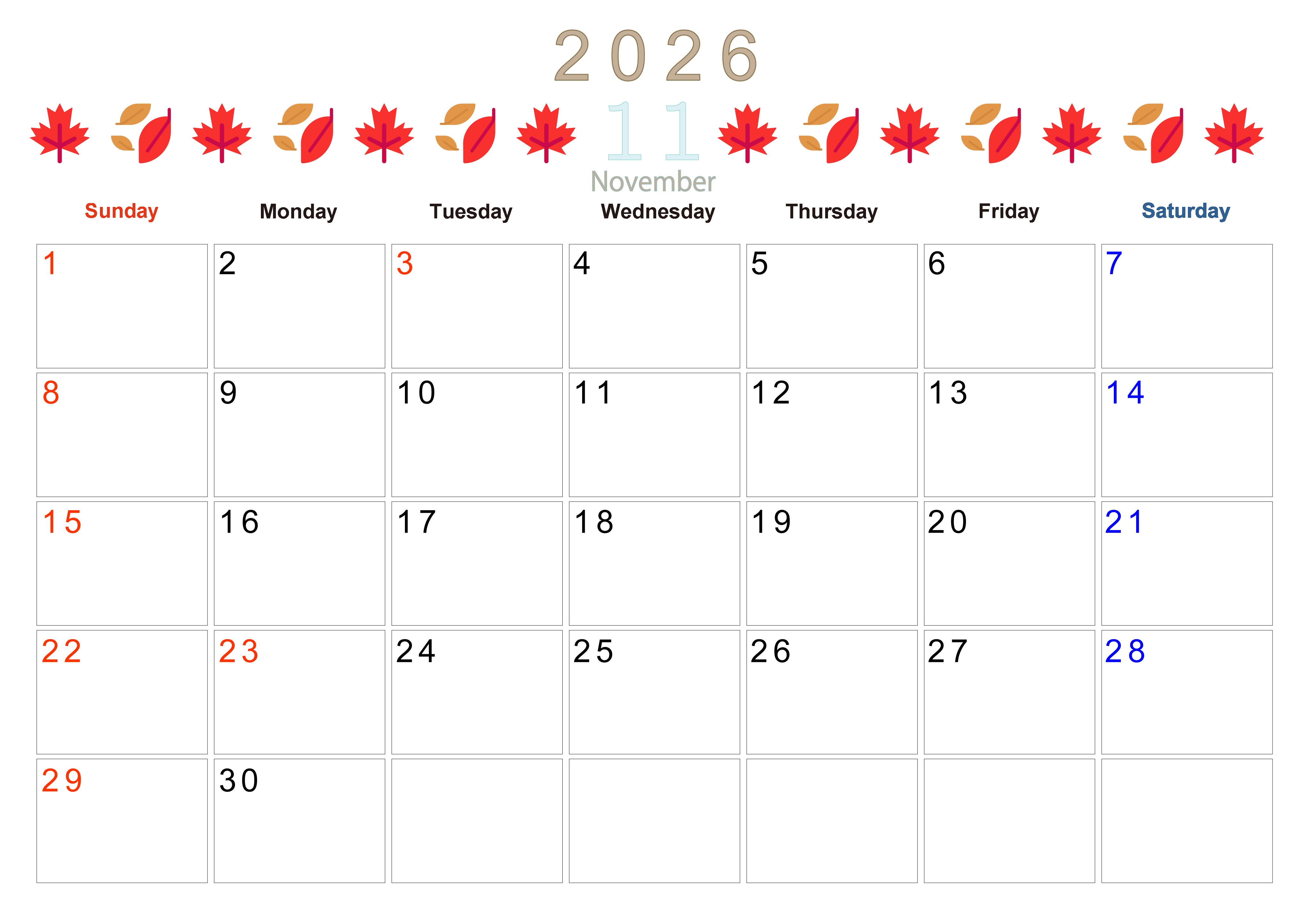 2026年・無料のカレンダーテンプレート 2026年11月カレンダーは横型日曜始まりで季節感あふれる行事のカラフルなイラストがおしゃれ:無料(2026-01371100) 素材状デザイン王 2025年4月11日 2026年11月カレンダーは横型日曜始まりで季節感のある行事のカラフルな絵文字イラストがおしゃれです。無料でダウンロードをして季節に合ったイラストをお楽しみください。(2026-01371100) おしゃれ 11月 季節 横型のカレンダー 日曜始まり カレンダーデザイン-0137