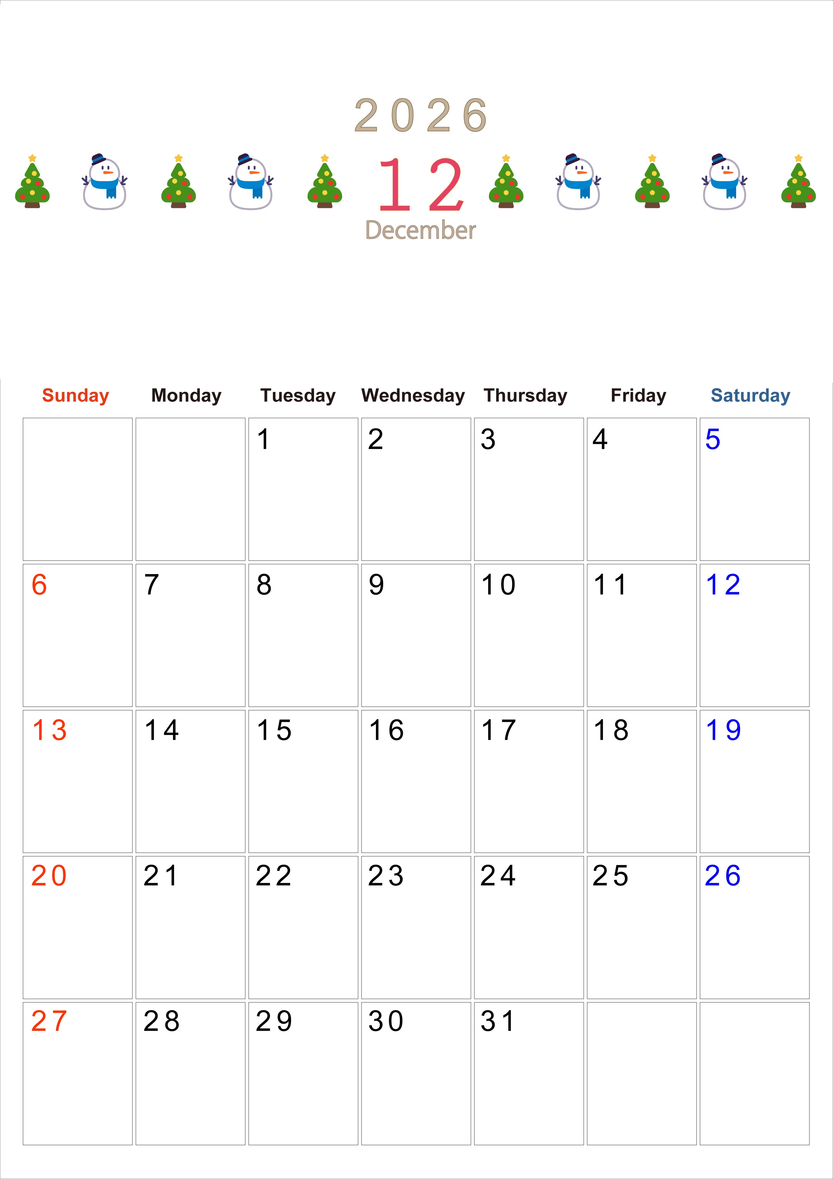 2026年12月カレンダーは縦型日曜始まりで季節感あふれる行事のカラフルなイラストがおしゃれ:無料(2026-01371210)