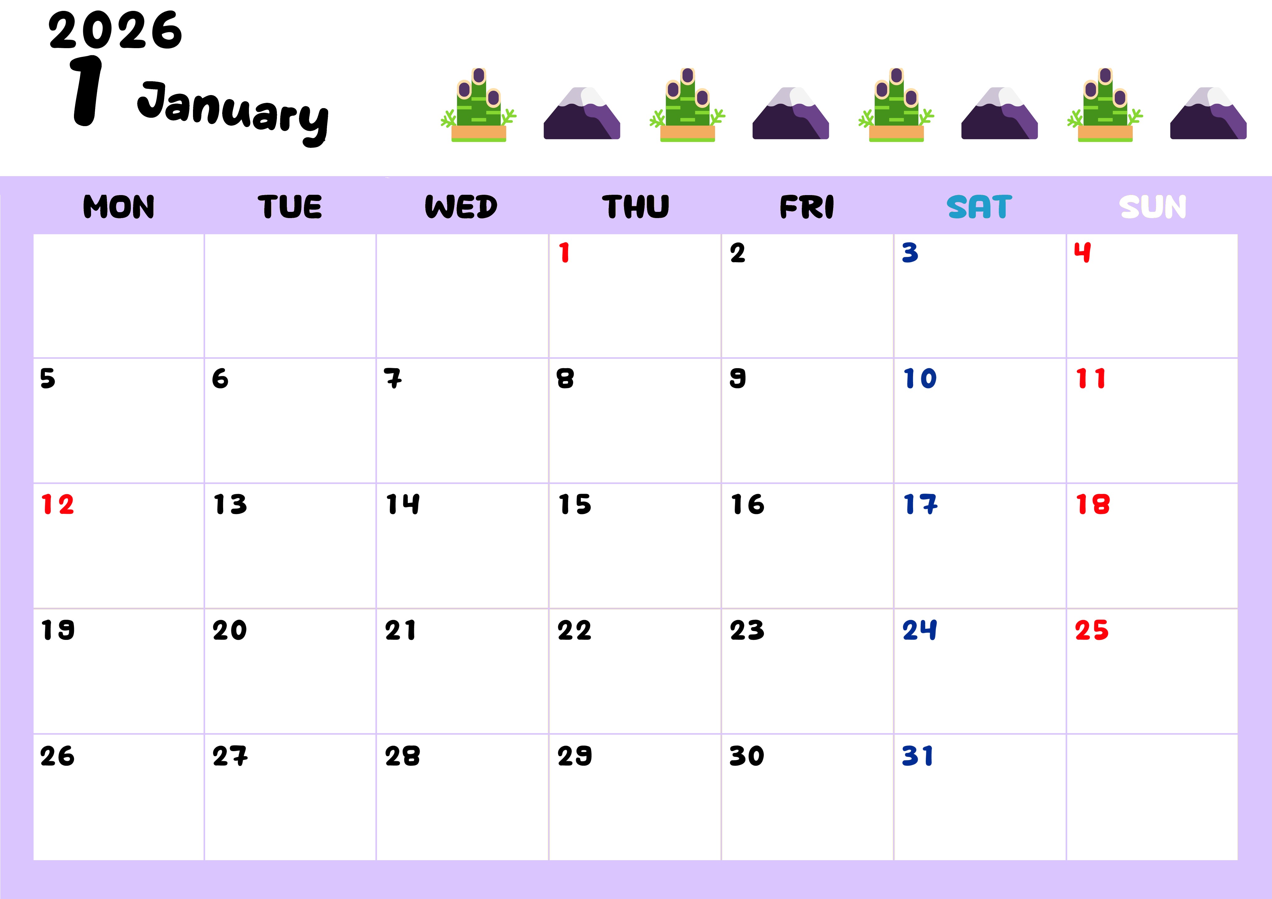 2026年1月カレンダーは横型月曜始まりで季節の行事の絵文字イラストがかわいいです。ダウンロードは無料なので継続して使いやすいカレンダーです。(2026-01380101)