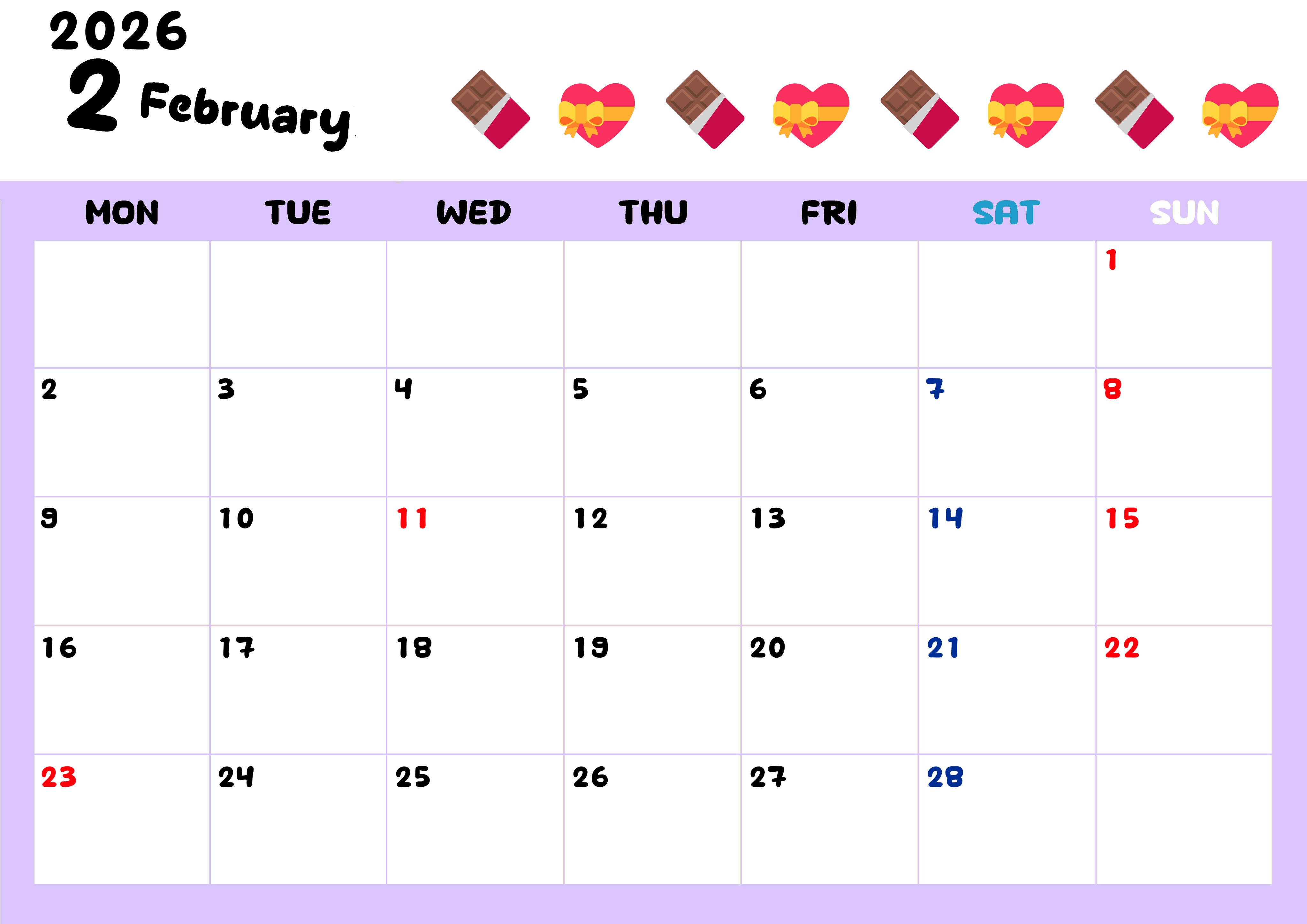 2026年・無料のカレンダーテンプレート 2026年2月カレンダーは横型月曜始まりで季節の行事の絵文字イラストがかわいい♪ダウンロードは無料♪(2026-01380201) 素材状デザイン王 2025年4月11日 2026年2月カレンダーは横型月曜始まりで季節の行事の絵文字イラストがかわいいです。ダウンロードは無料なので継続して使いやすいカレンダーです。(2026-01380201) かわいい 2月 季節 横型のカレンダー 月曜始まり カレンダーデザイン-0138