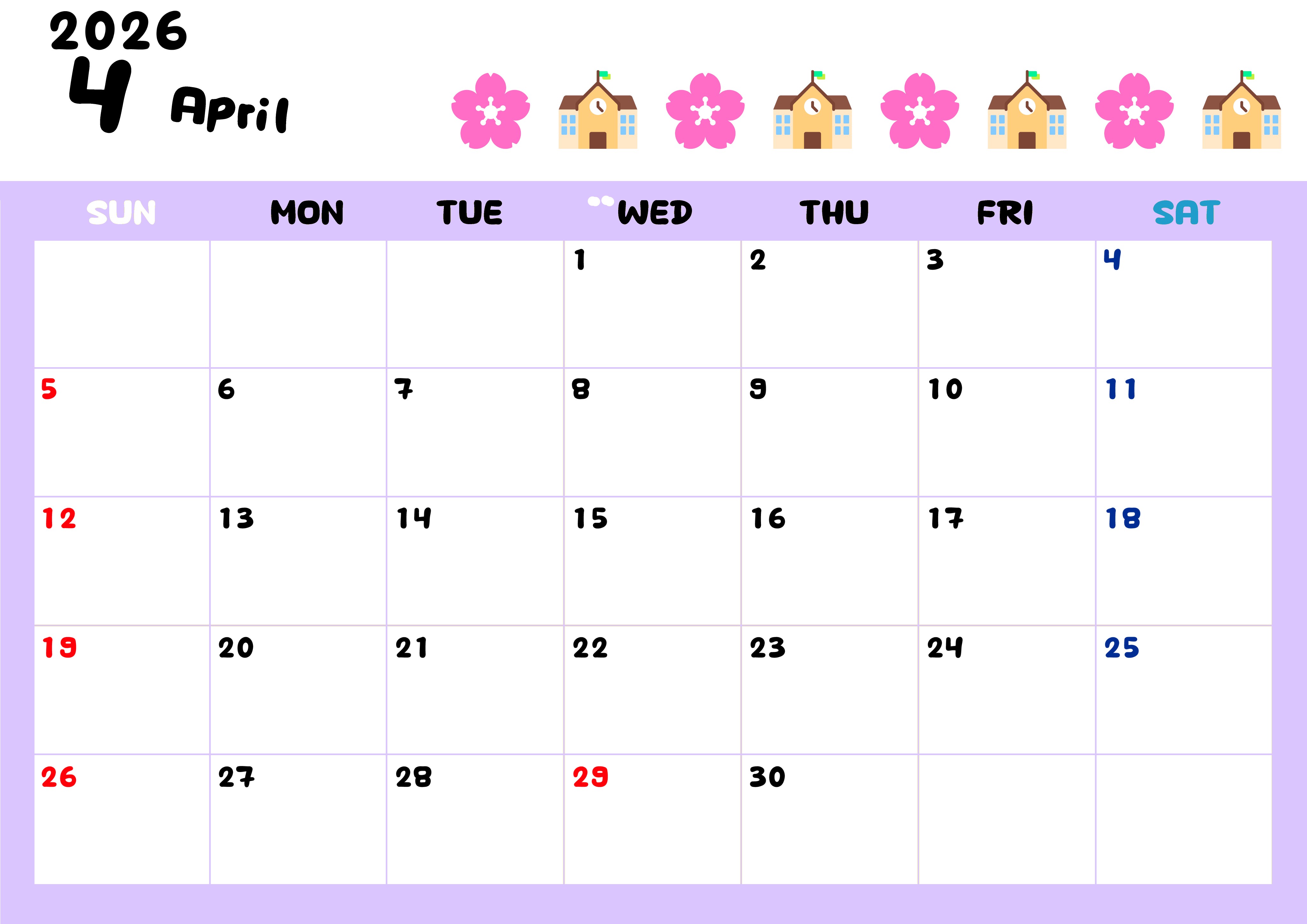 2026年・無料のカレンダーテンプレート 2026年4月カレンダーは横型日曜始まりで季節の行事の絵文字イラストがかわいい♪ダウンロードは無料♪(2026-01380400) 素材状デザイン王 2025年4月11日 2026年4月カレンダーは横型日曜始まりで季節の行事の絵文字イラストがかわいいです。ダウンロードは無料なので継続して使いやすいカレンダーです。(2026-01380400) かわいい 4月 季節 横型のカレンダー 日曜始まり カレンダーデザイン-0138