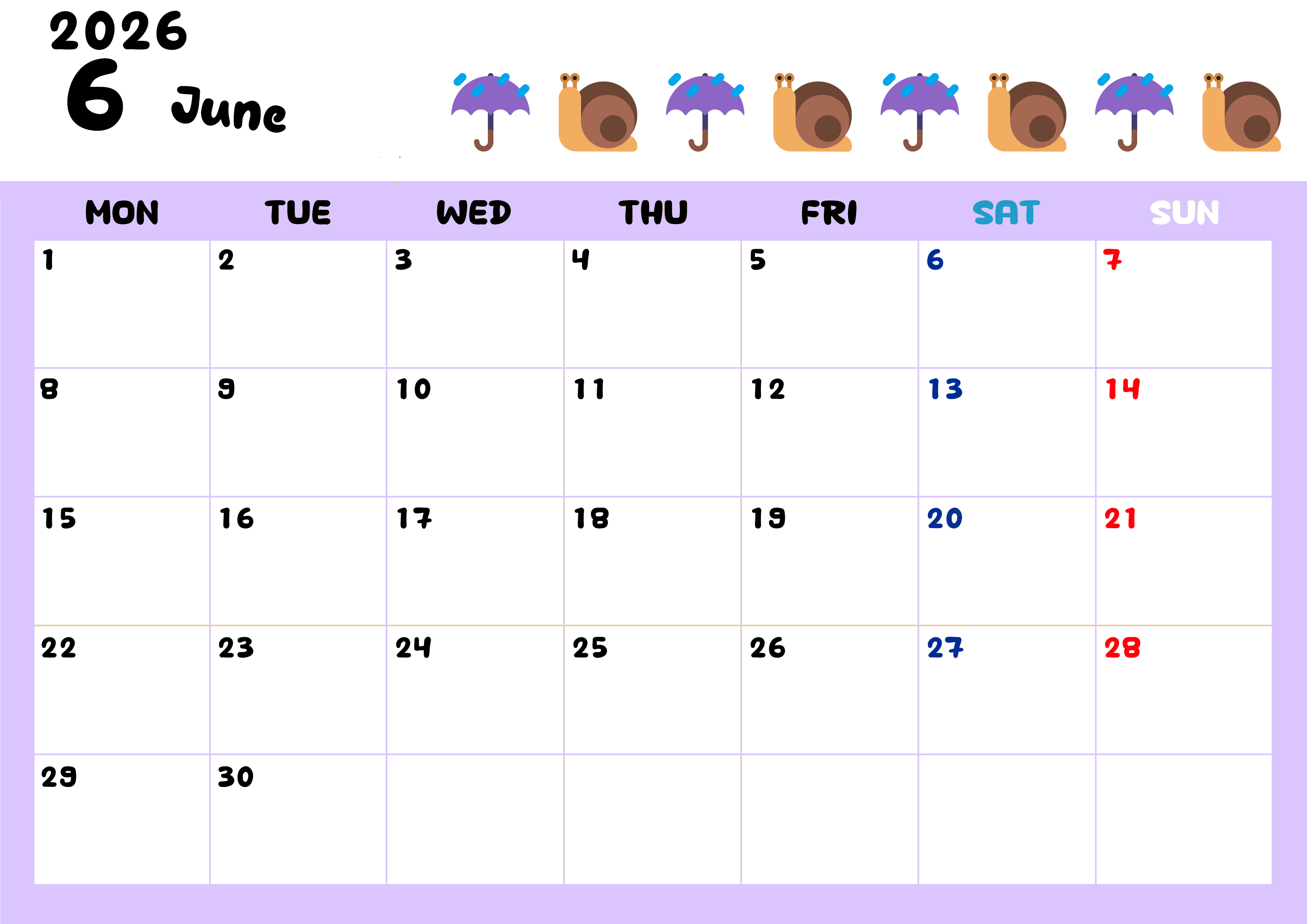 2026年・無料のカレンダーテンプレート 2026年6月カレンダーは横型月曜始まりで季節の行事の絵文字イラストがかわいい♪ダウンロードは無料♪(2026-01380601) 素材状デザイン王 2025年4月11日 2026年6月カレンダーは横型月曜始まりで季節の行事の絵文字イラストがかわいいです。ダウンロードは無料なので継続して使いやすいカレンダーです。(2026-01380601) かわいい 6月 季節 横型のカレンダー 月曜始まり カレンダーデザイン-0138