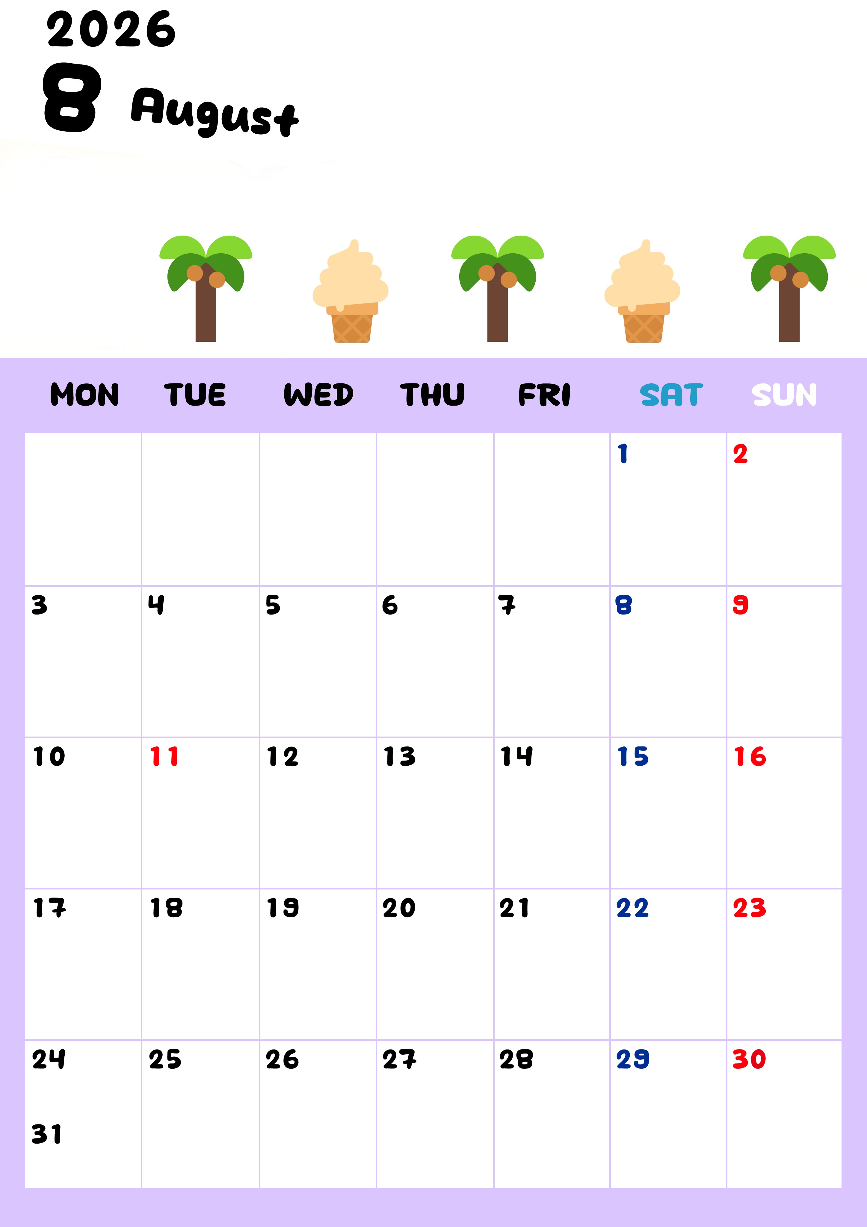 2026年・無料のカレンダーテンプレート 2026年8月カレンダーは縦型月曜始まりで季節の行事の絵文字イラストがかわいい♪ダウンロードは無料♪(2026-01380811) 素材状デザイン王 2025年4月11日 2026年8月カレンダーは縦型月曜始まりで季節の行事の絵文字イラストがかわいいです。ダウンロードは無料なので継続して使いやすいカレンダーです。(2026-01380811) かわいい 8月 季節 縦型のカレンダー 月曜始まり カレンダーデザイン-0138
