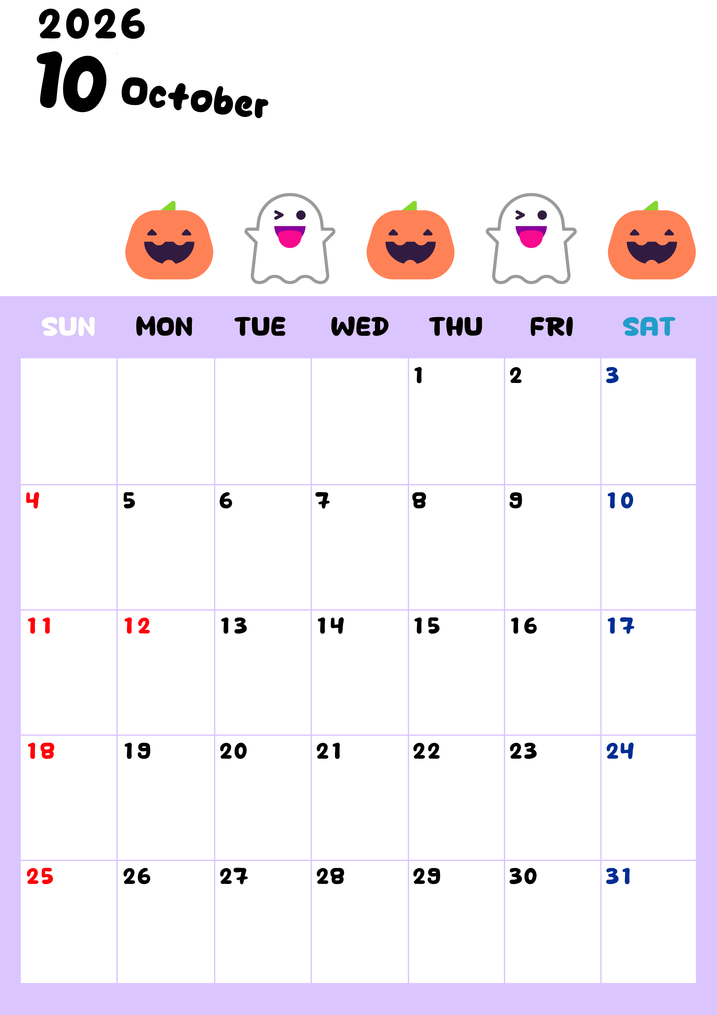 2026年10月カレンダーは縦型日曜始まりで季節の行事の絵文字イラストがかわいいです。ダウンロードは無料なので継続して使いやすいカレンダーです。(2026-01381010)