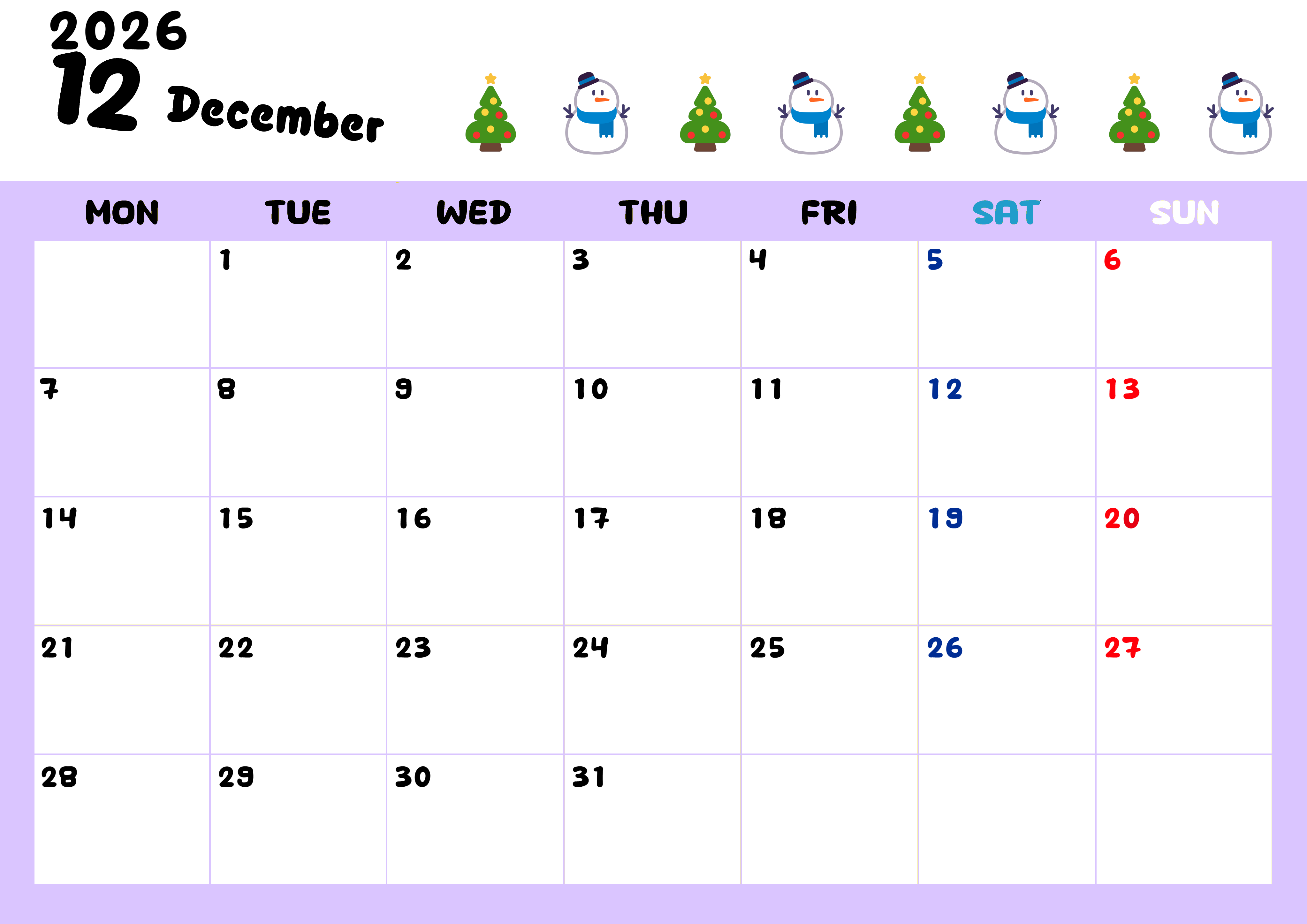 2026年・無料のカレンダーテンプレート 2026年12月カレンダーは横型月曜始まりで季節の行事の絵文字イラストがかわいい♪ダウンロードは無料♪(2026-01381201) 素材状デザイン王 2025年4月11日 2026年12月カレンダーは横型月曜始まりで季節の行事の絵文字イラストがかわいいです。ダウンロードは無料なので継続して使いやすいカレンダーです。(2026-01381201) かわいい 12月 季節 横型のカレンダー 月曜始まり カレンダーデザイン-0138