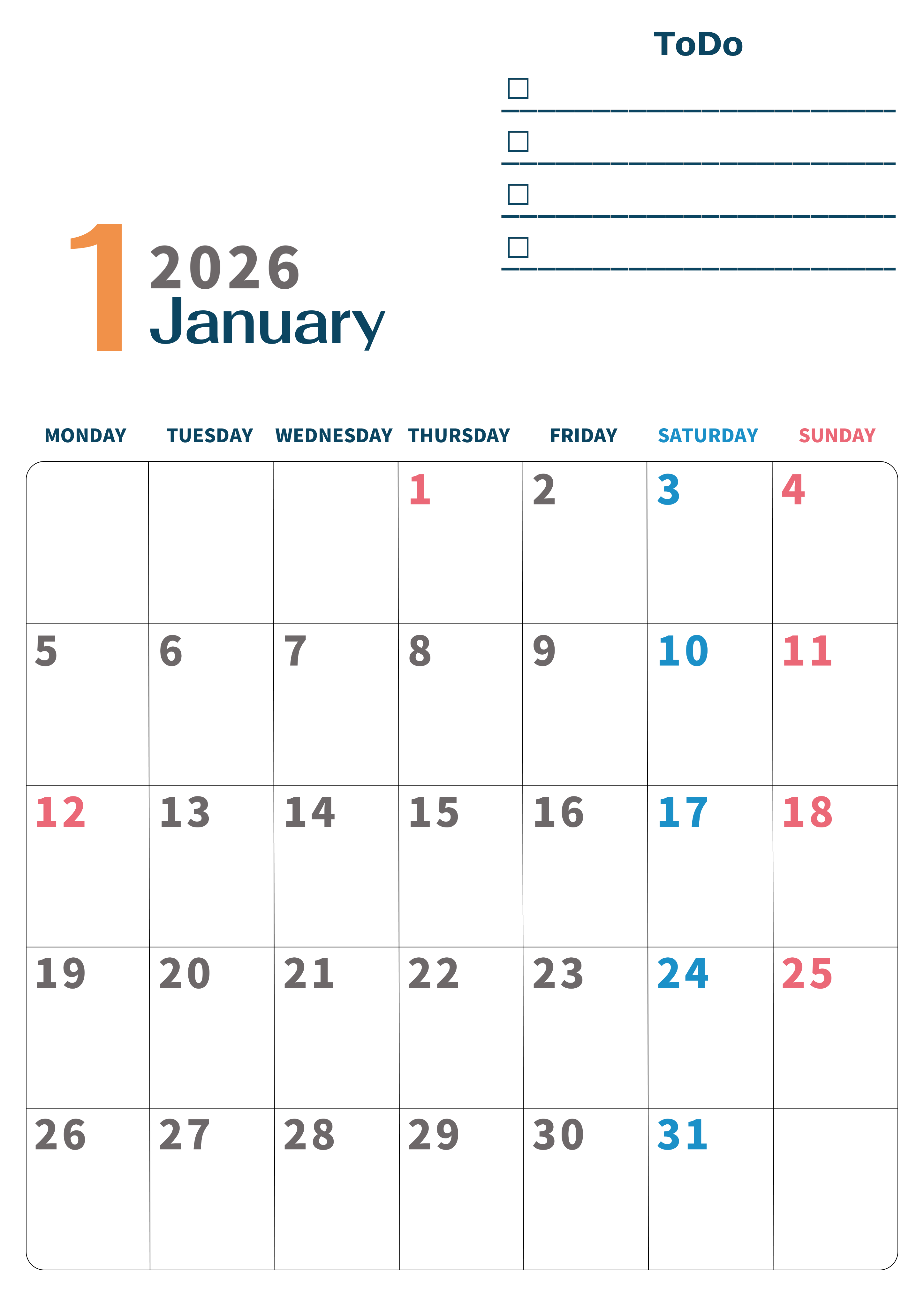 2026年・無料のカレンダーテンプレート 2026年1月カレンダーは縦型月曜始まりでToDoリストつき♪使いやすいおすすめ無料素材♪(2026-01390111) 素材状デザイン王 2025年4月12日 2026年1月カレンダーは縦型月曜始まりりでToDoリストつきです。使いやすいおすすめ無料素材なのでダウンロードして印刷利用をしましょう。(2026-01390111) 1月 縦型のカレンダー 月曜始まり ToDoリスト カレンダーデザイン-0139
