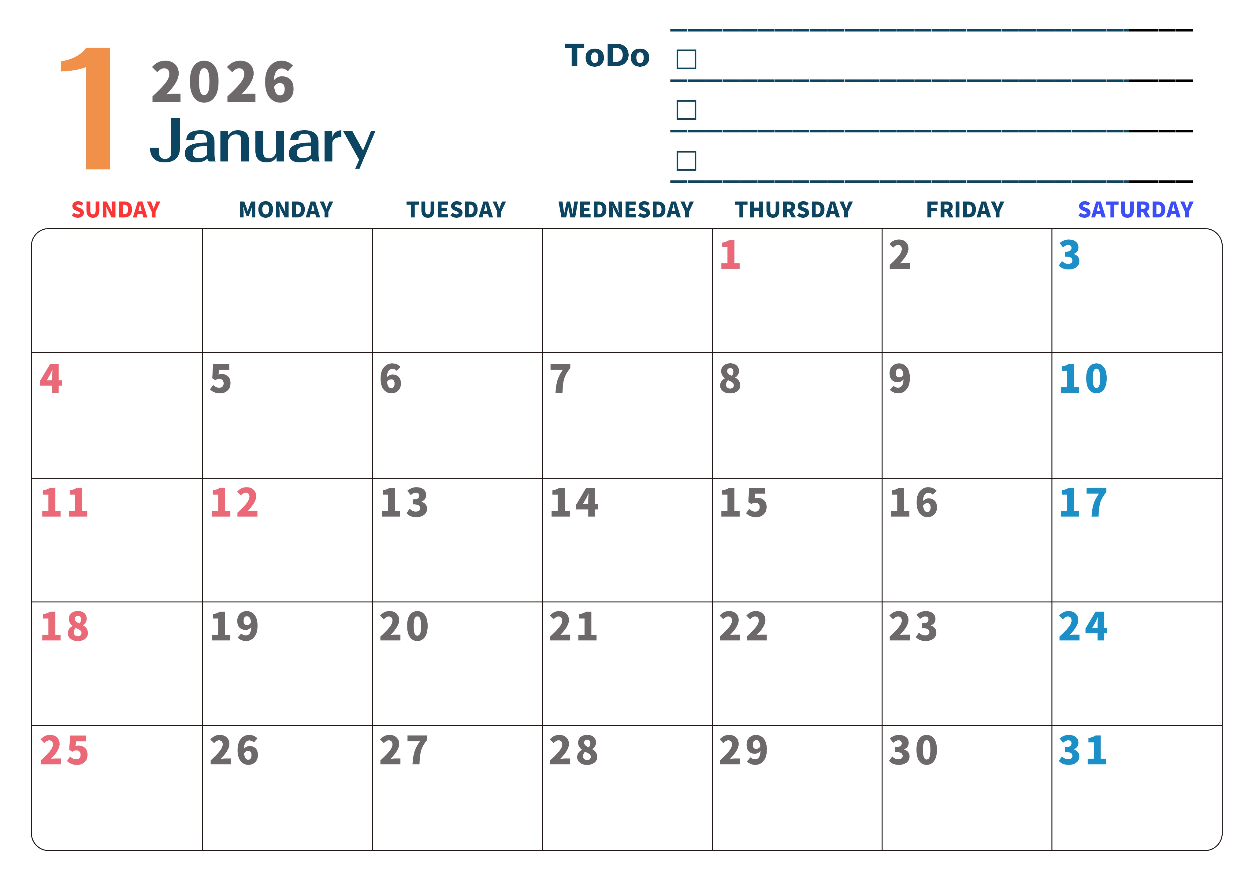 2026年1月カレンダーは横型日曜始まりりでToDoリストつきです。使いやすいおすすめ無料素材なのでダウンロードして印刷利用をしましょう。(2026-01390100)
