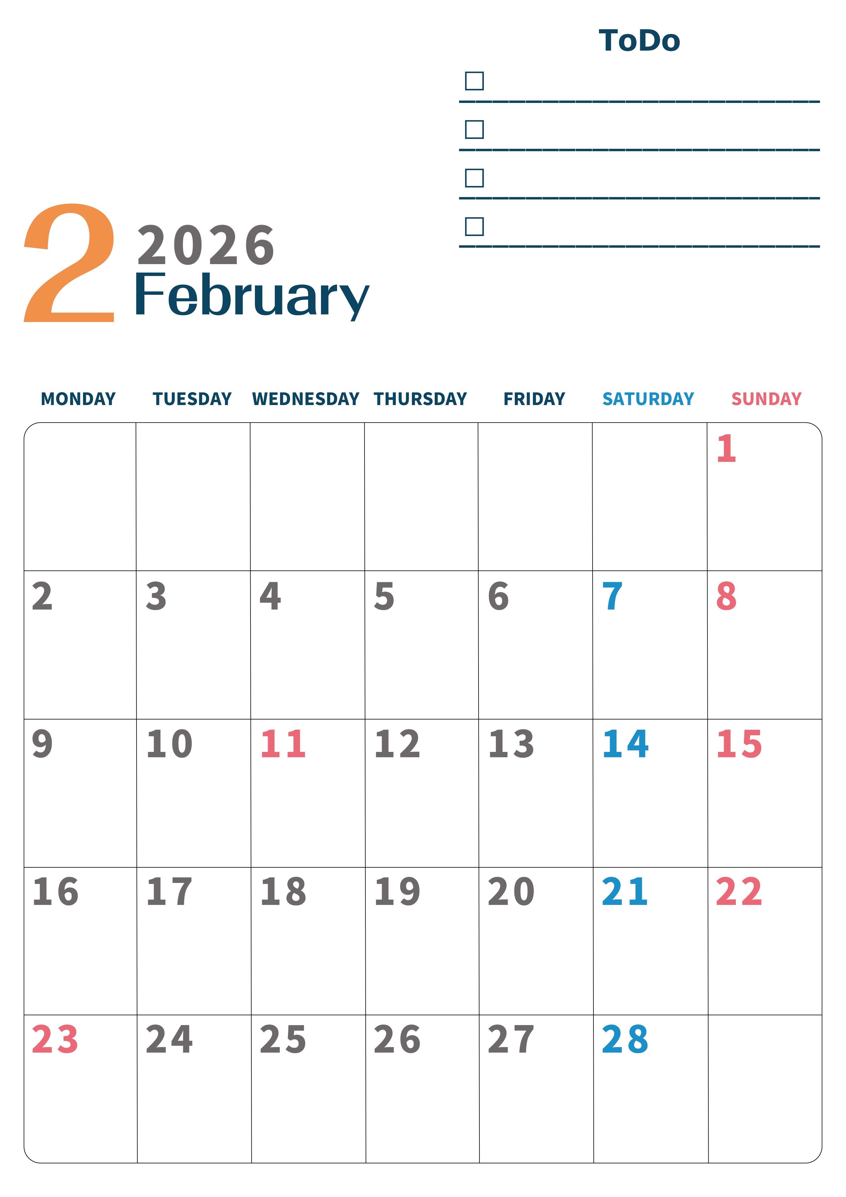 2026年2月カレンダーは縦型月曜始まりりでToDoリストつきです。使いやすいおすすめ無料素材なのでダウンロードして印刷利用をしましょう。(2026-01390211)