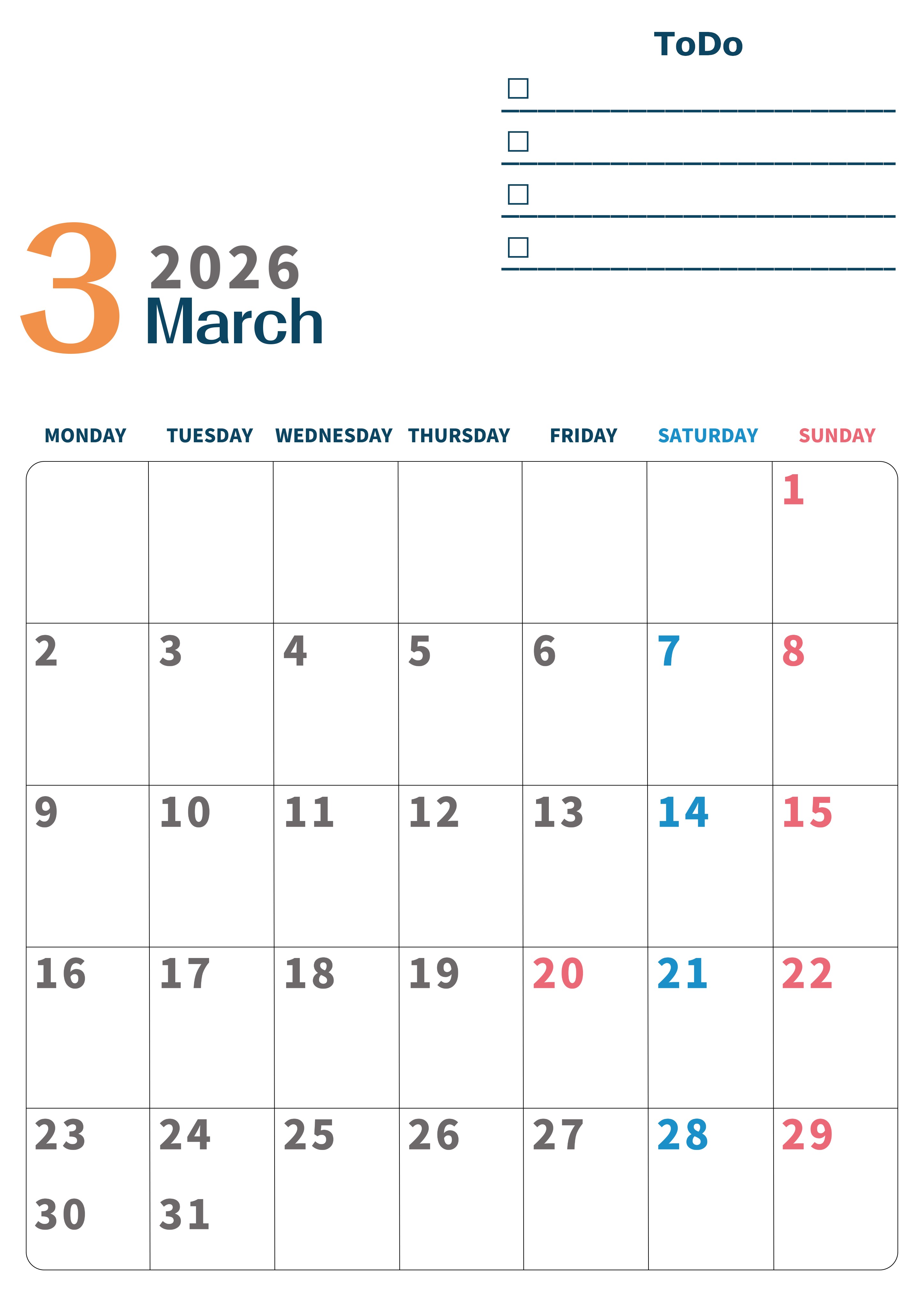 2026年・無料のカレンダーテンプレート 2026年3月カレンダーは縦型月曜始まりでToDoリストつき♪使いやすいおすすめ無料素材♪(2026-01390311) 素材状デザイン王 2025年4月12日 2026年3月カレンダーは縦型月曜始まりりでToDoリストつきです。使いやすいおすすめ無料素材なのでダウンロードして印刷利用をしましょう。(2026-01390311) 3月 縦型のカレンダー 月曜始まり ToDoリスト カレンダーデザイン-0139