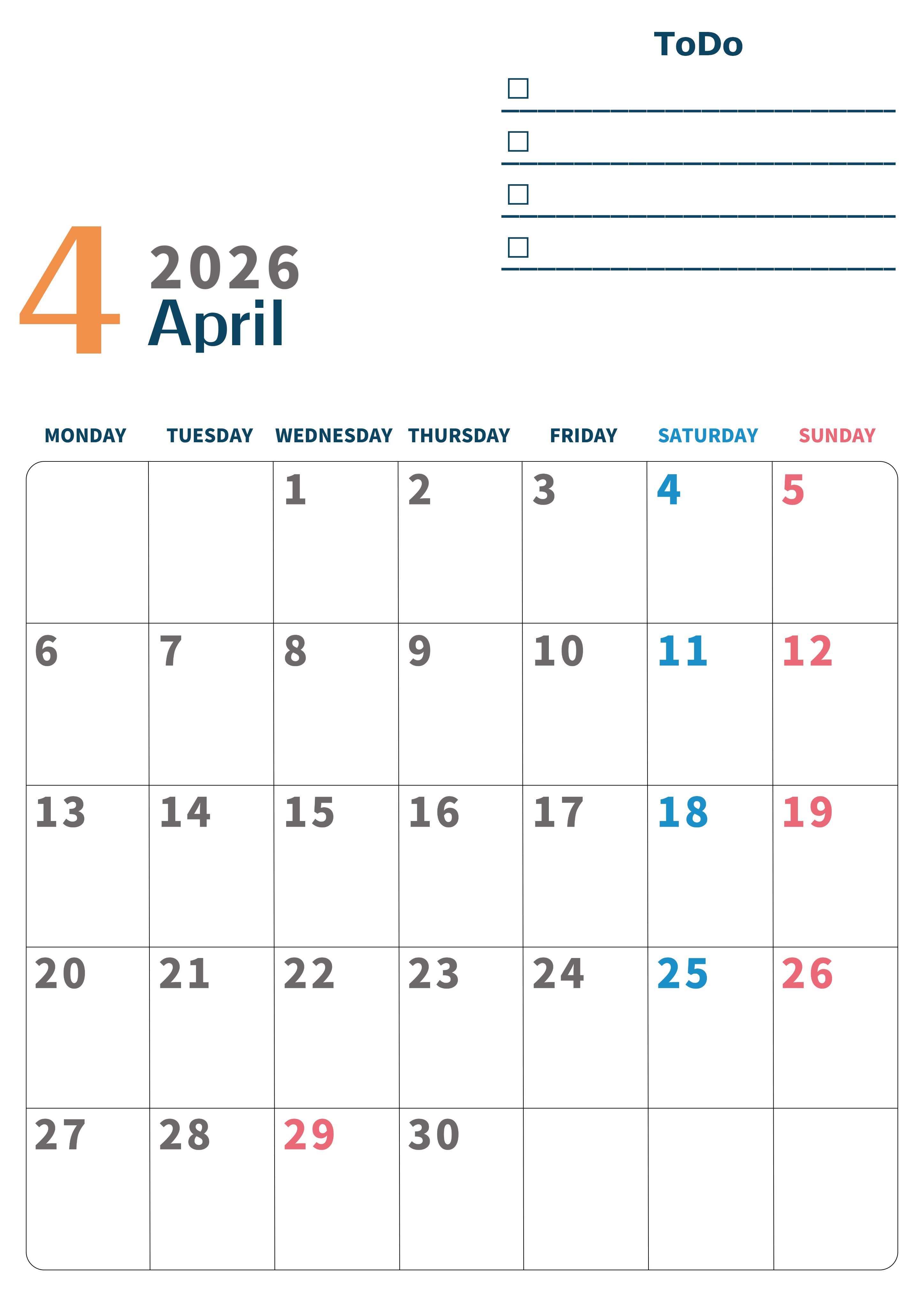 2026年・無料のカレンダーテンプレート 2026年4月カレンダーは縦型月曜始まりでToDoリストつき♪使いやすいおすすめ無料素材♪(2026-01390411) 素材状デザイン王 2025年4月12日 2026年4月カレンダーは縦型月曜始まりりでToDoリストつきです。使いやすいおすすめ無料素材なのでダウンロードして印刷利用をしましょう。(2026-01390411) 4月 縦型のカレンダー 月曜始まり ToDoリスト カレンダーデザイン-0139