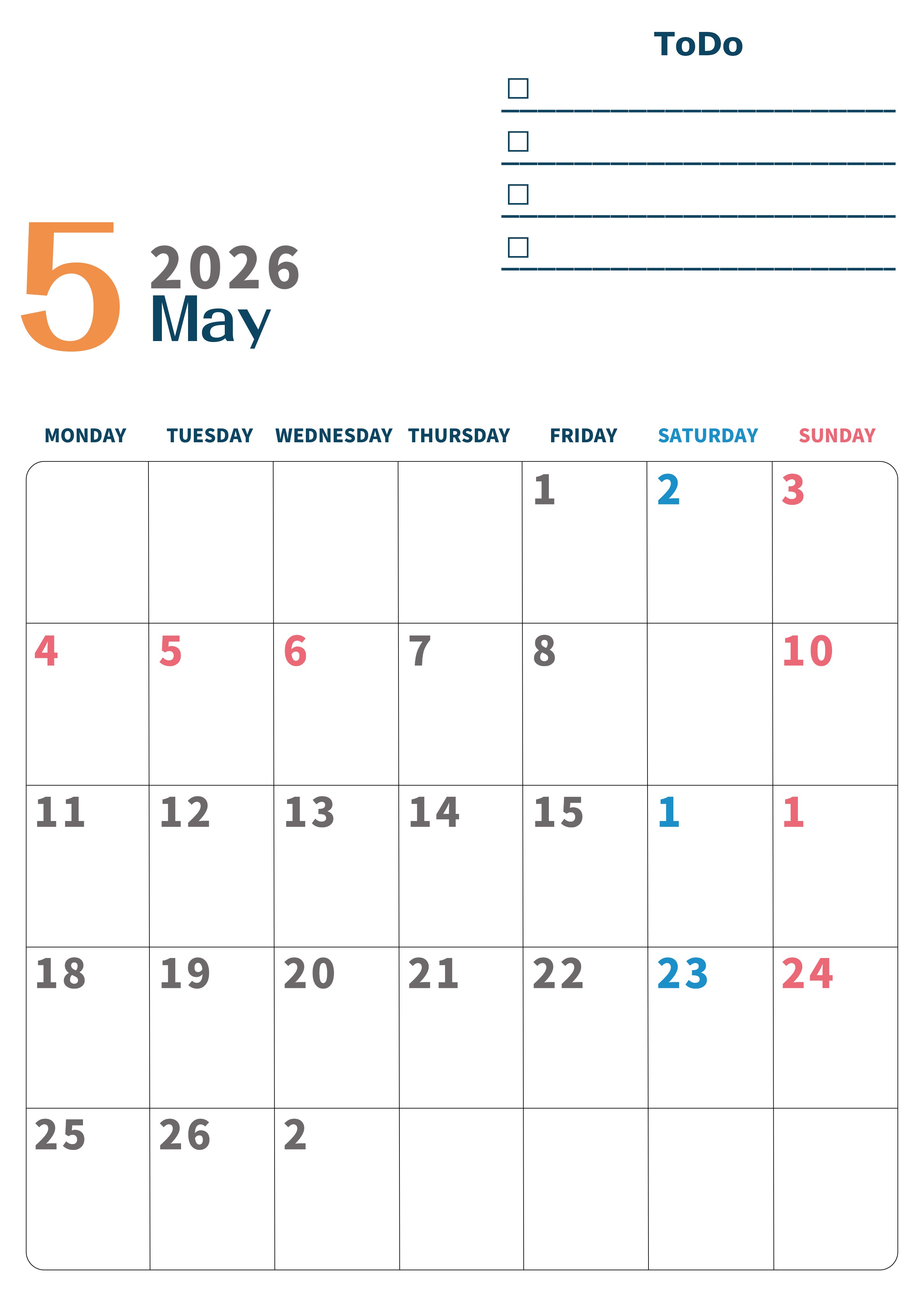 2026年・無料のカレンダーテンプレート 2026年5月カレンダーは縦型月曜始まりでToDoリストつき♪使いやすいおすすめ無料素材♪(2026-01390511) 素材状デザイン王 2025年4月12日 2026年5月カレンダーは縦型月曜始まりりでToDoリストつきです。使いやすいおすすめ無料素材なのでダウンロードして印刷利用をしましょう。(2026-01390511) 5月 縦型のカレンダー 月曜始まり ToDoリスト カレンダーデザイン-0139