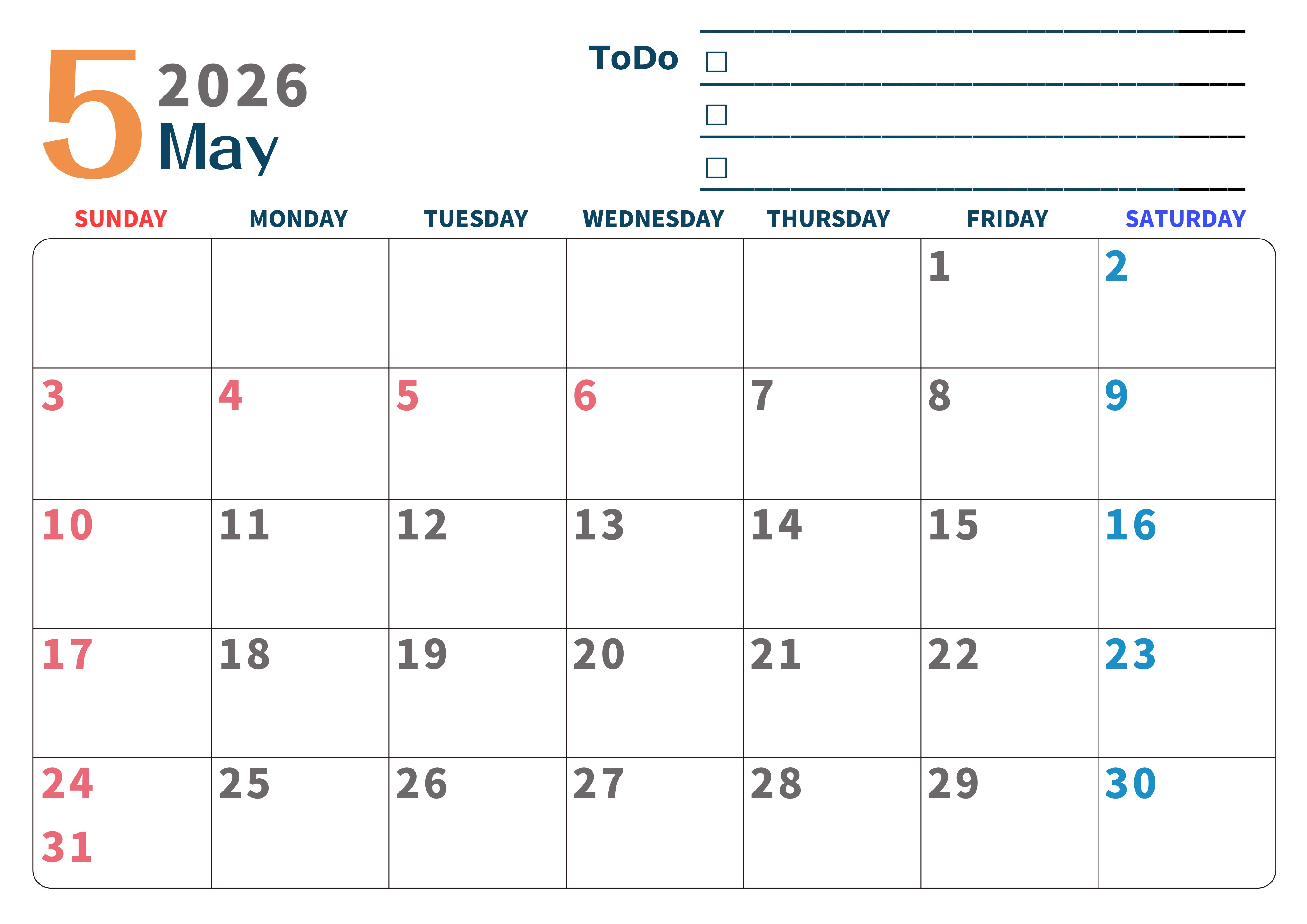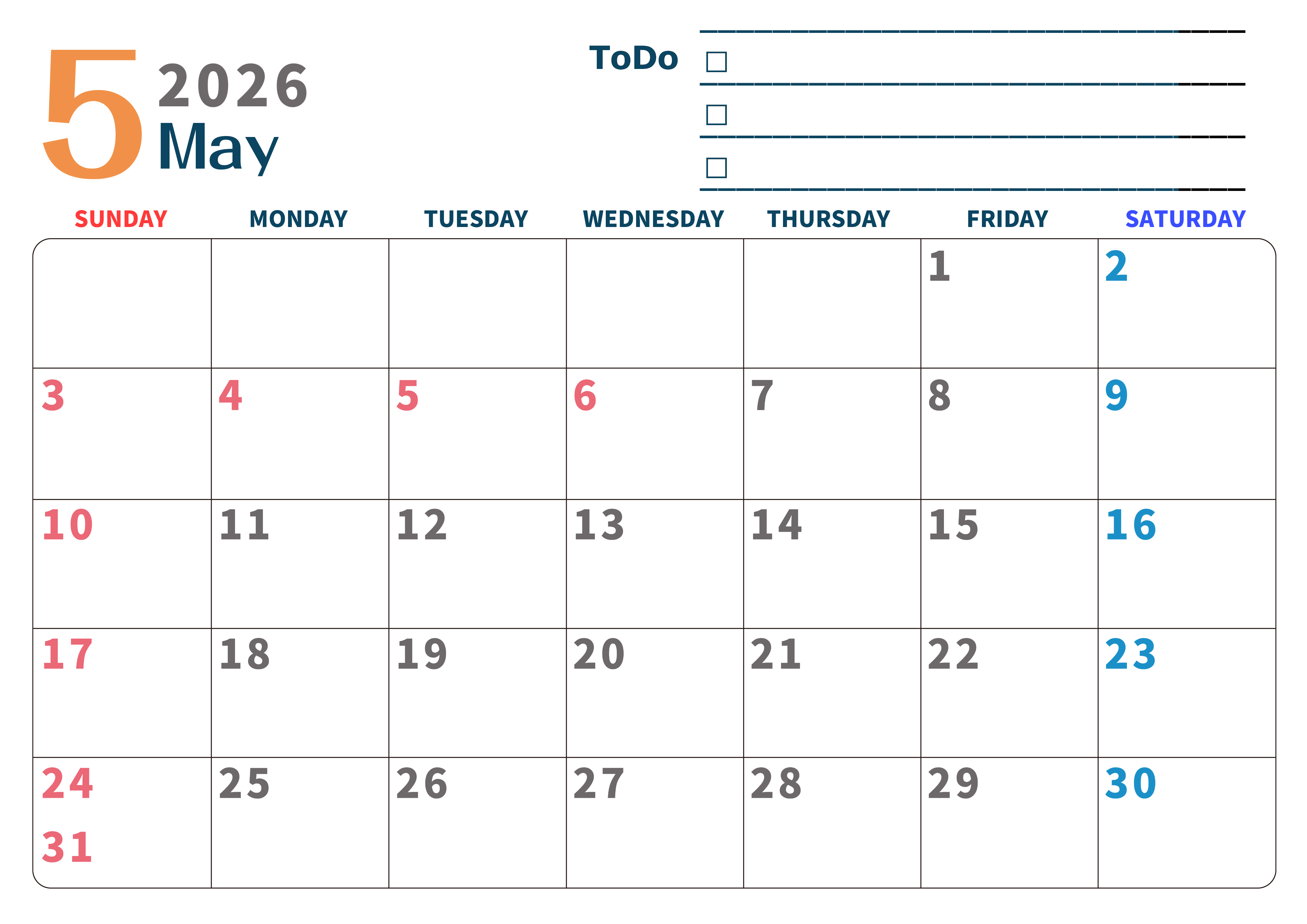 2026年5月カレンダーは横型日曜始まりりでToDoリストつきです。使いやすいおすすめ無料素材なのでダウンロードして印刷利用をしましょう。(2026-01390500)