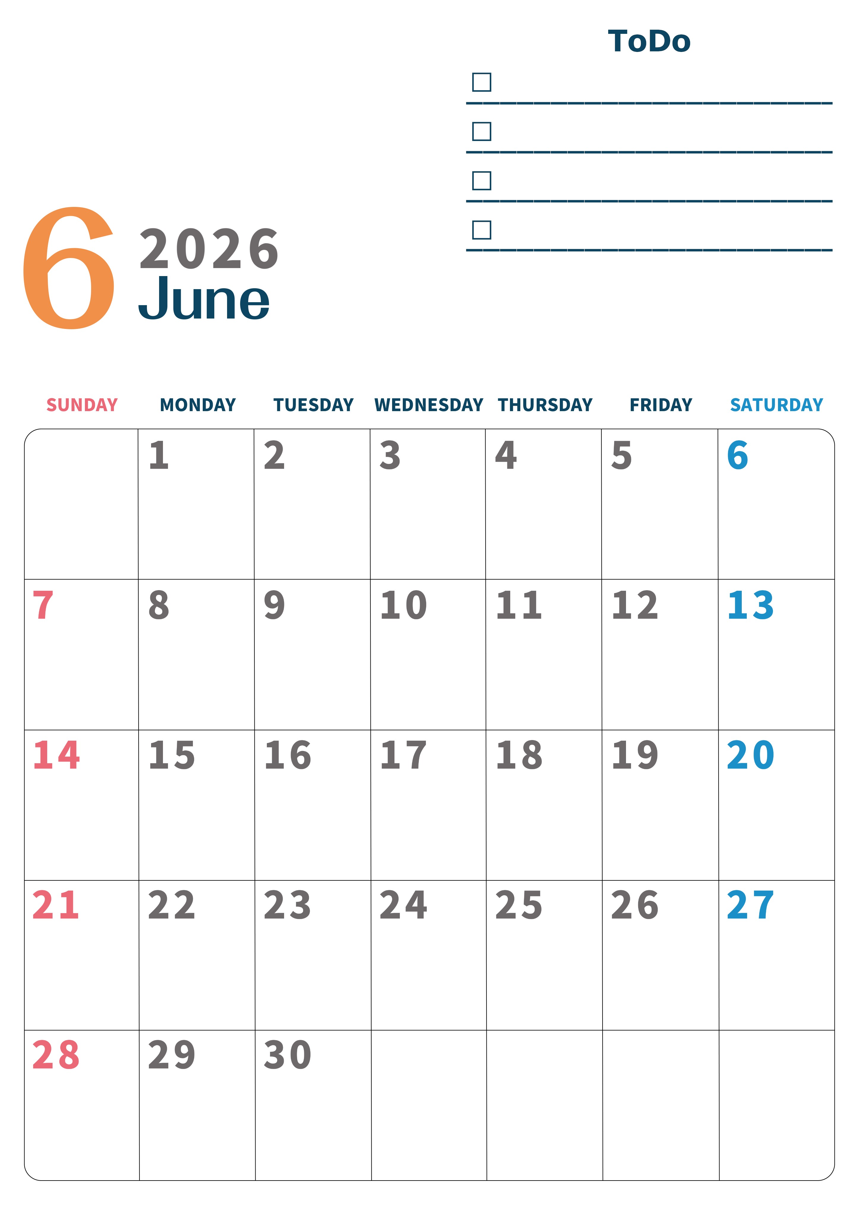 2026年・無料のカレンダーテンプレート 2026年6月カレンダーは縦型日曜始まりでToDoリストつき♪使いやすいおすすめ無料素材♪(2026-01390610) 素材状デザイン王 2025年4月12日 2026年6月カレンダーは縦型日曜始まりりでToDoリストつきです。使いやすいおすすめ無料素材なのでダウンロードして印刷利用をしましょう。(2026-01390610) 6月 縦型のカレンダー 日曜始まり ToDoリスト カレンダーデザイン-0139