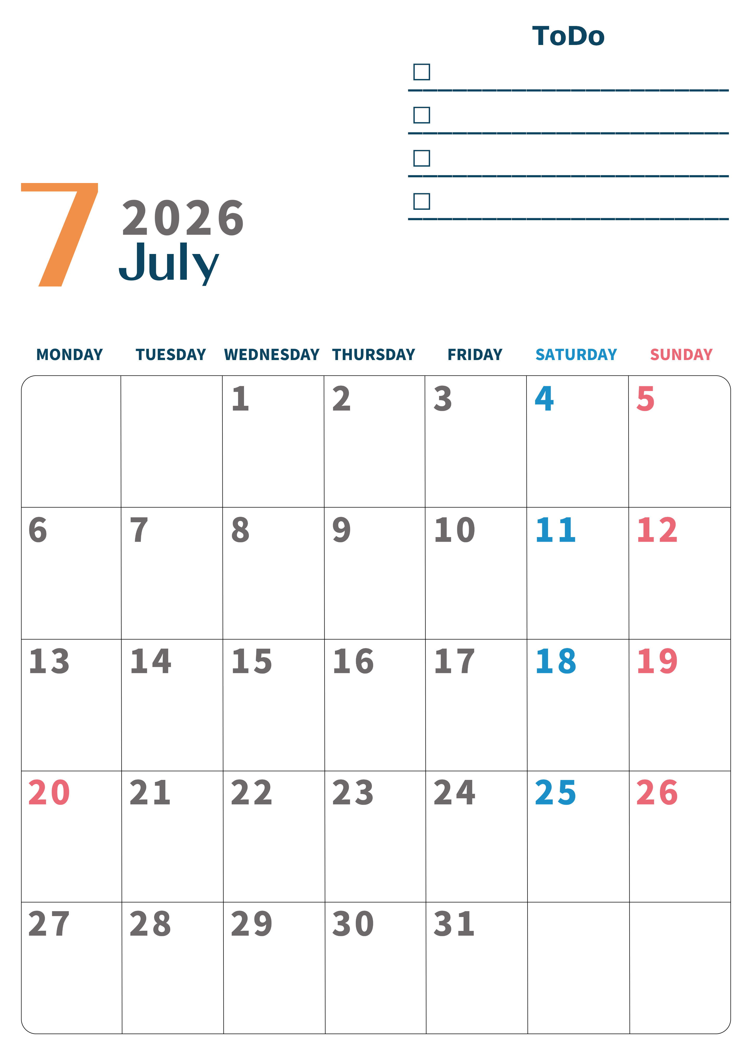 2026年7月カレンダーは縦型月曜始まりりでToDoリストつきです。使いやすいおすすめ無料素材なのでダウンロードして印刷利用をしましょう。(2026-01390711)