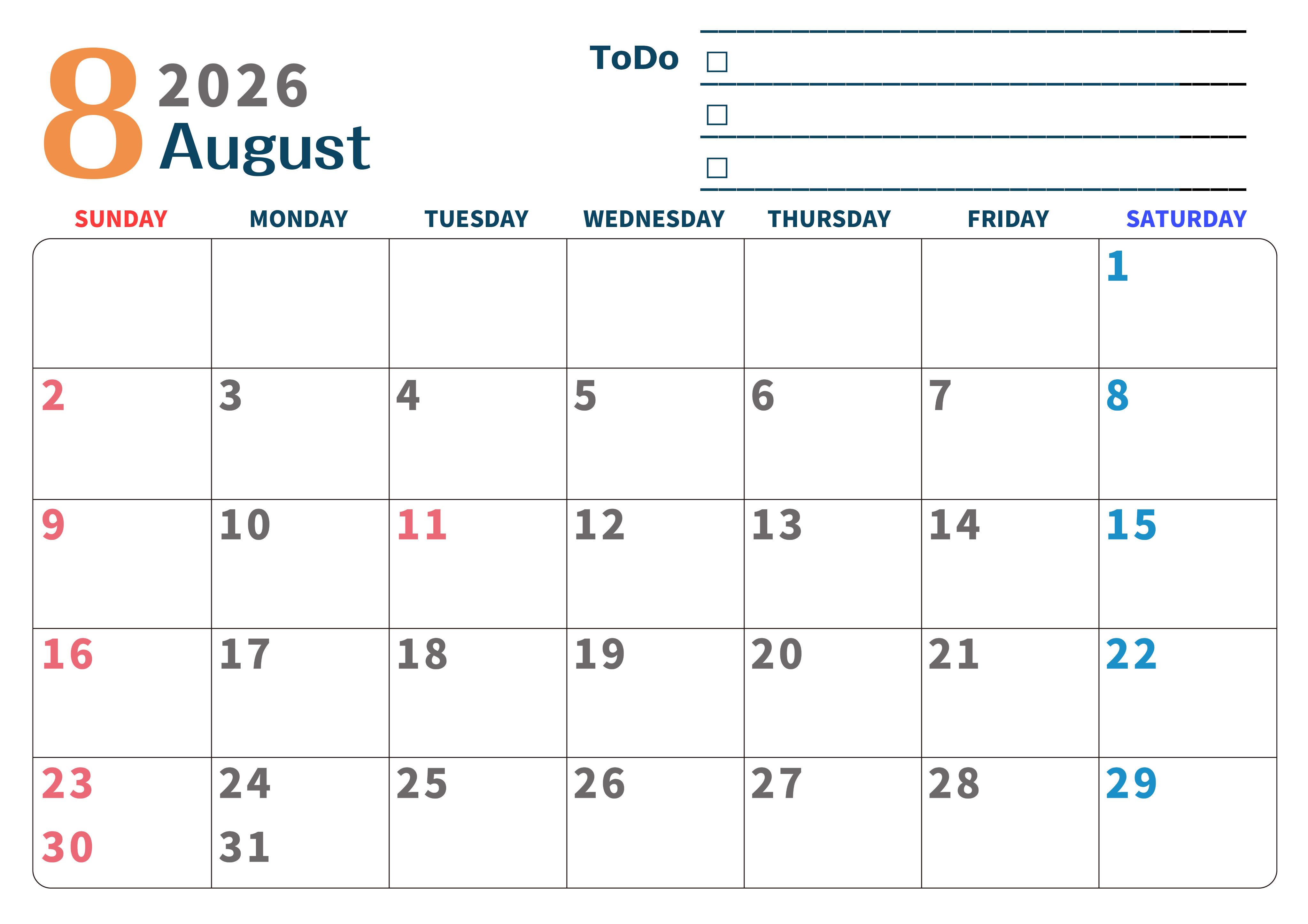 2026年・無料のカレンダーテンプレート 2026年8月カレンダーは横型日曜始まりでToDoリストつき♪使いやすいおすすめ無料素材♪(2026-01390800) 素材状デザイン王 2025年4月12日 2026年8月カレンダーは横型日曜始まりりでToDoリストつきです。使いやすいおすすめ無料素材なのでダウンロードして印刷利用をしましょう。(2026-01390800) 8月 横型のカレンダー 日曜始まり ToDoリスト カレンダーデザイン-0139
