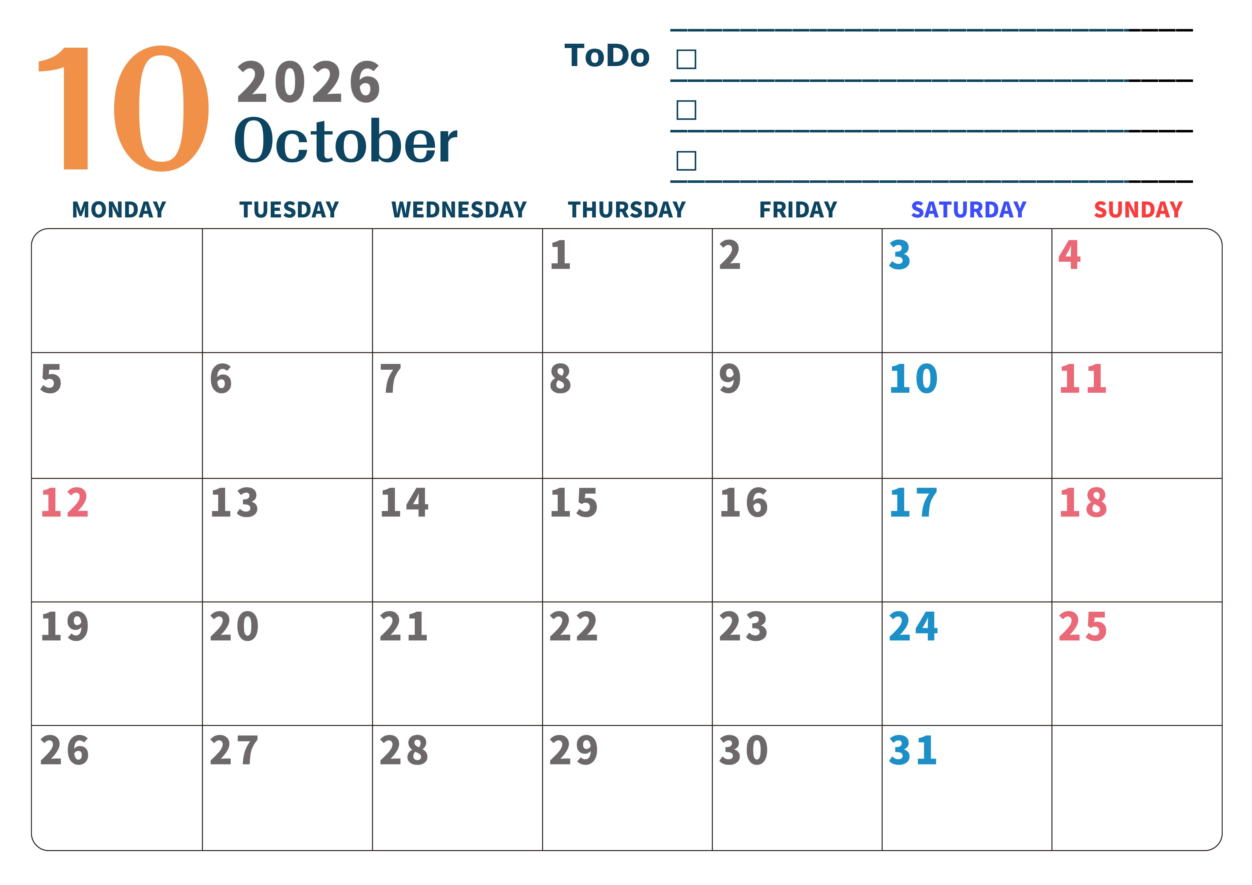 2026年・無料のカレンダーテンプレート 2026年10月カレンダーは横型月曜始まりでToDoリストつき♪使いやすいおすすめ無料素材♪(2026-01391001) 素材状デザイン王 2025年4月12日 2026年10月カレンダーは横型月曜始まりりでToDoリストつきです。使いやすいおすすめ無料素材なのでダウンロードして印刷利用をしましょう。(2026-01391001) 10月 横型のカレンダー 月曜始まり ToDoリスト カレンダーデザイン-0139