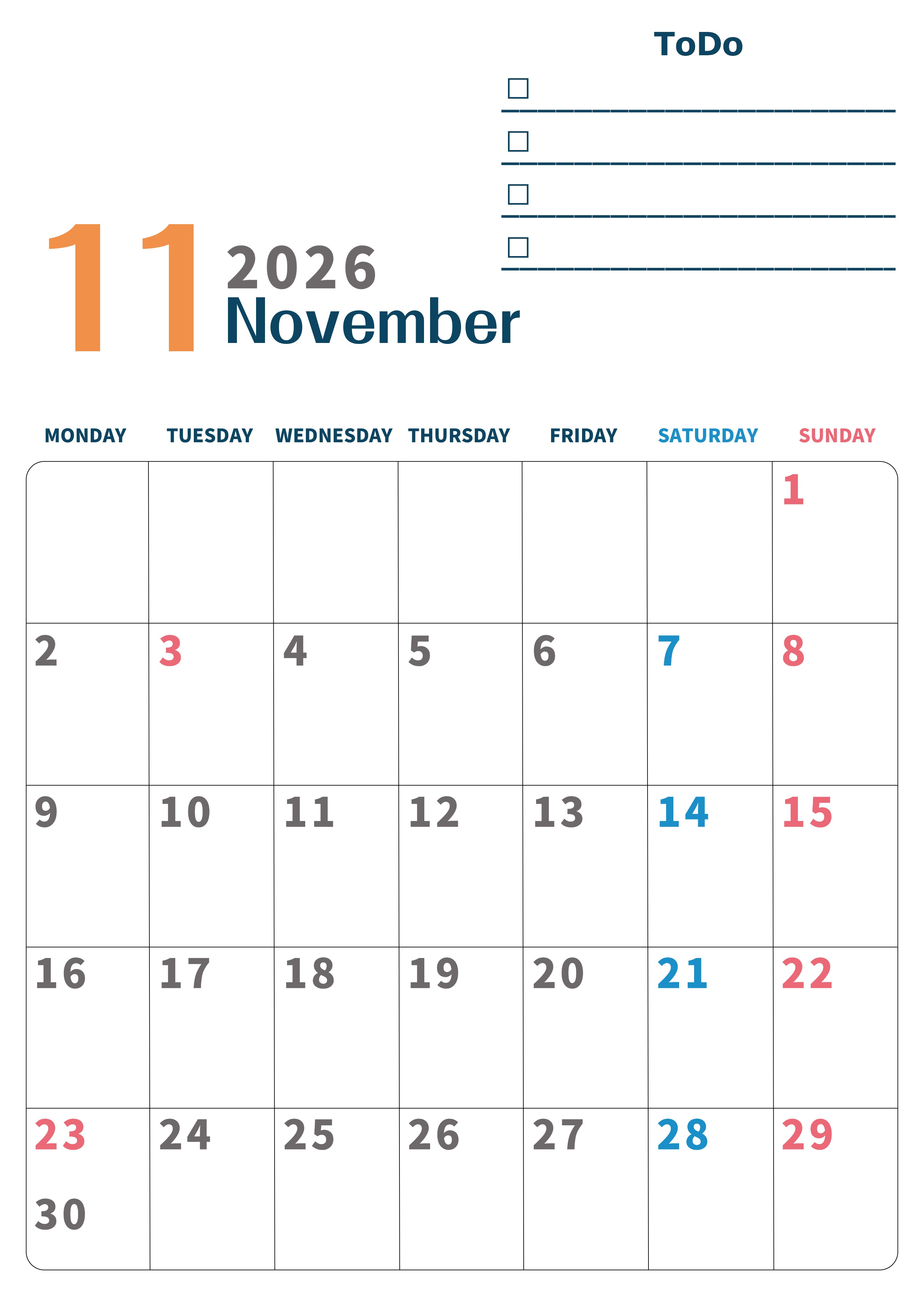 2026年・無料のカレンダーテンプレート 2026年11月カレンダーは縦型月曜始まりでToDoリストつき♪使いやすいおすすめ無料素材♪(2026-01391111) 素材状デザイン王 2025年4月12日 2026年11月カレンダーは縦型月曜始まりりでToDoリストつきです。使いやすいおすすめ無料素材なのでダウンロードして印刷利用をしましょう。(2026-01391111) 11月 縦型のカレンダー 月曜始まり ToDoリスト カレンダーデザイン-0139
