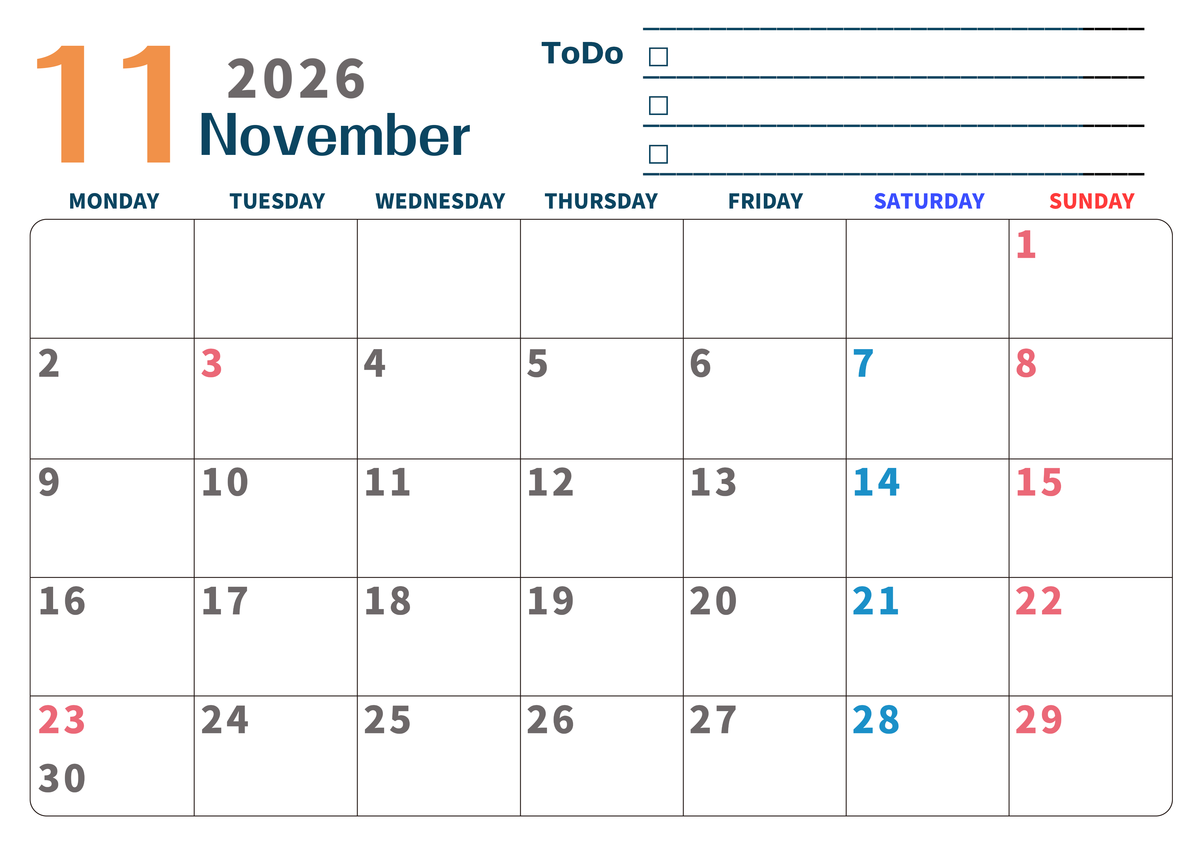 2026年・無料のカレンダーテンプレート 2026年11月カレンダーは横型月曜始まりでToDoリストつき♪使いやすいおすすめ無料素材♪(2026-01391101) 素材状デザイン王 2025年4月12日 2026年11月カレンダーは横型月曜始まりりでToDoリストつきです。使いやすいおすすめ無料素材なのでダウンロードして印刷利用をしましょう。(2026-01391101) 11月 横型のカレンダー 月曜始まり ToDoリスト カレンダーデザイン-0139