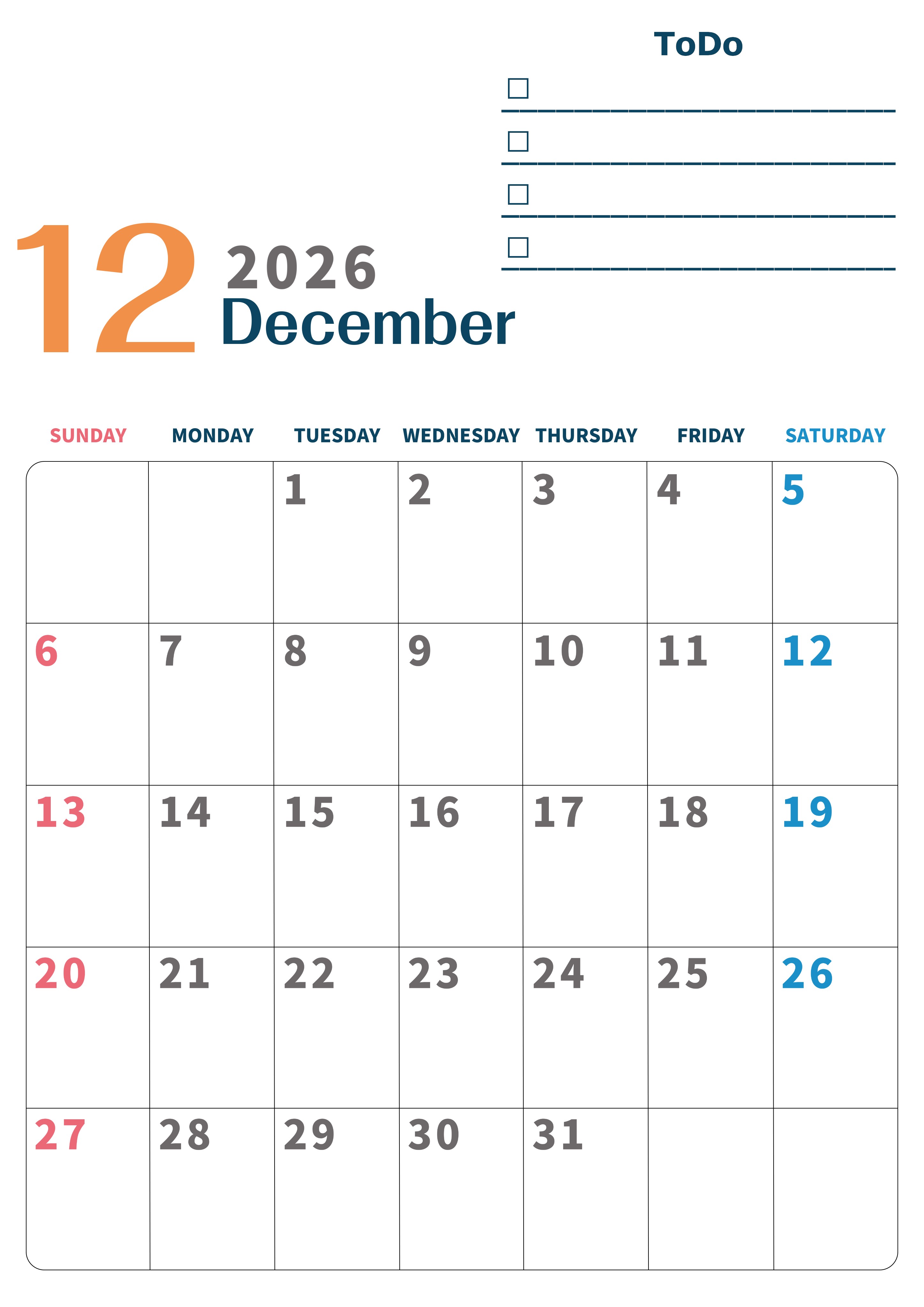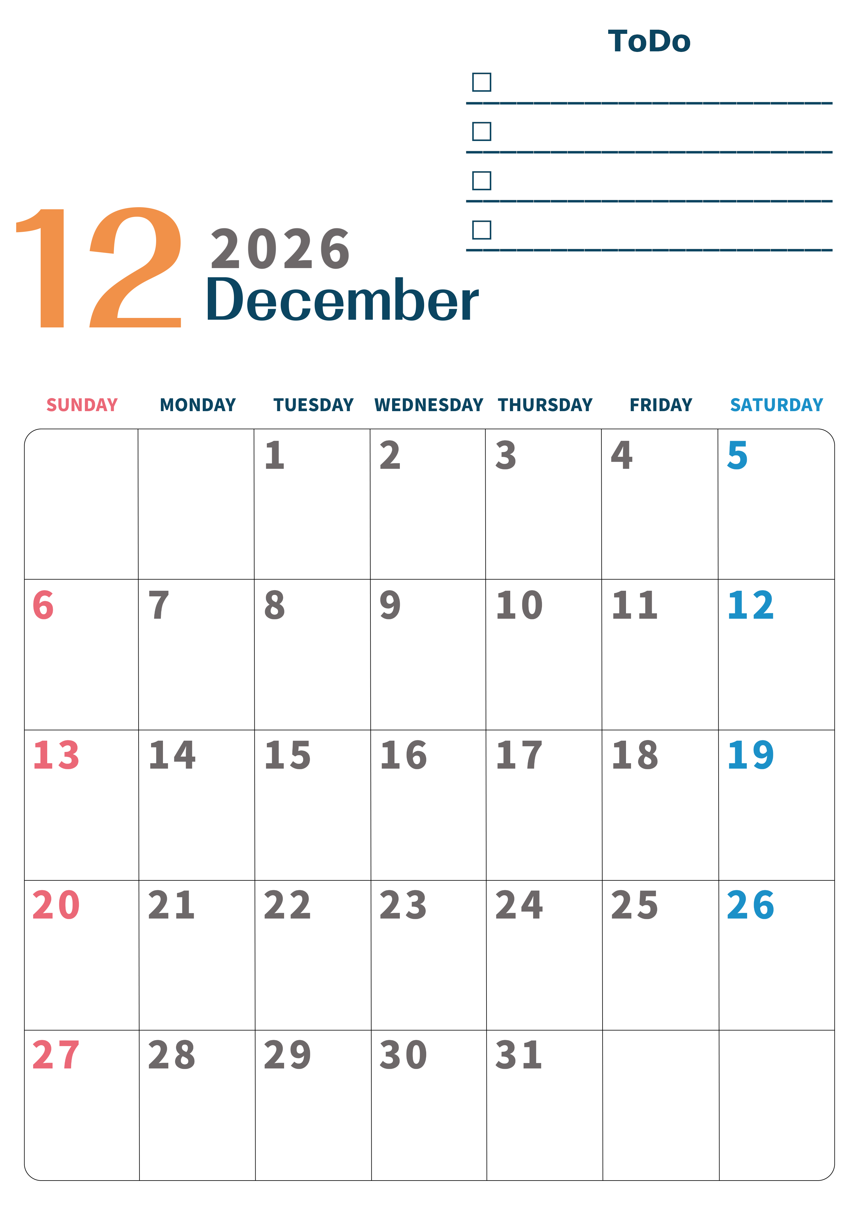 2026年・無料のカレンダーテンプレート 2026年12月カレンダーは縦型日曜始まりでToDoリストつき♪使いやすいおすすめ無料素材♪(2026-01391210) 素材状デザイン王 2025年4月12日 2026年12月カレンダーは縦型日曜始まりりでToDoリストつきです。使いやすいおすすめ無料素材なのでダウンロードして印刷利用をしましょう。(2026-01391210) 12月 縦型のカレンダー 日曜始まり ToDoリスト カレンダーデザイン-0139