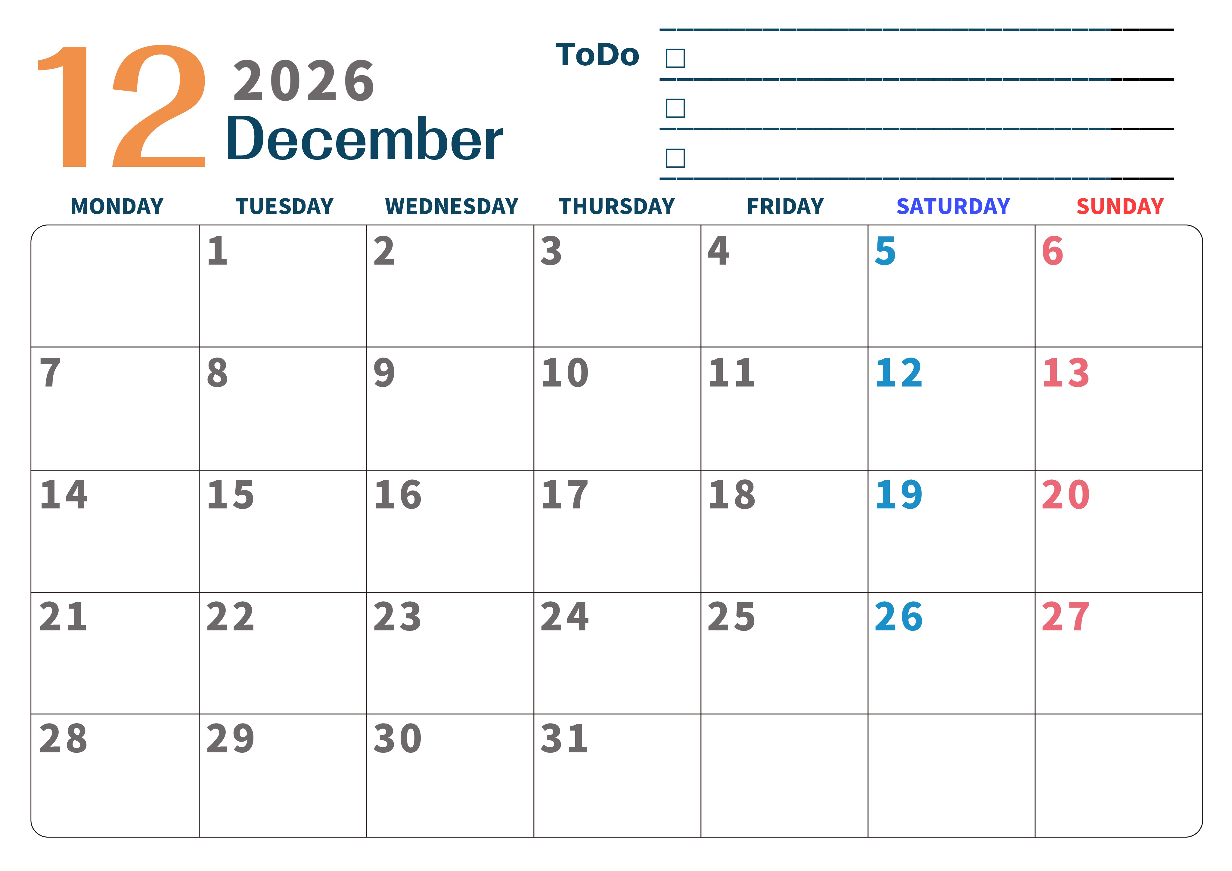 2026年・無料のカレンダーテンプレート 2026年12月カレンダーは横型月曜始まりでToDoリストつき♪使いやすいおすすめ無料素材♪(2026-01391201) 素材状デザイン王 2025年4月12日 2026年12月カレンダーは横型月曜始まりりでToDoリストつきです。使いやすいおすすめ無料素材なのでダウンロードして印刷利用をしましょう。(2026-01391201) 12月 横型のカレンダー 月曜始まり ToDoリスト カレンダーデザイン-0139