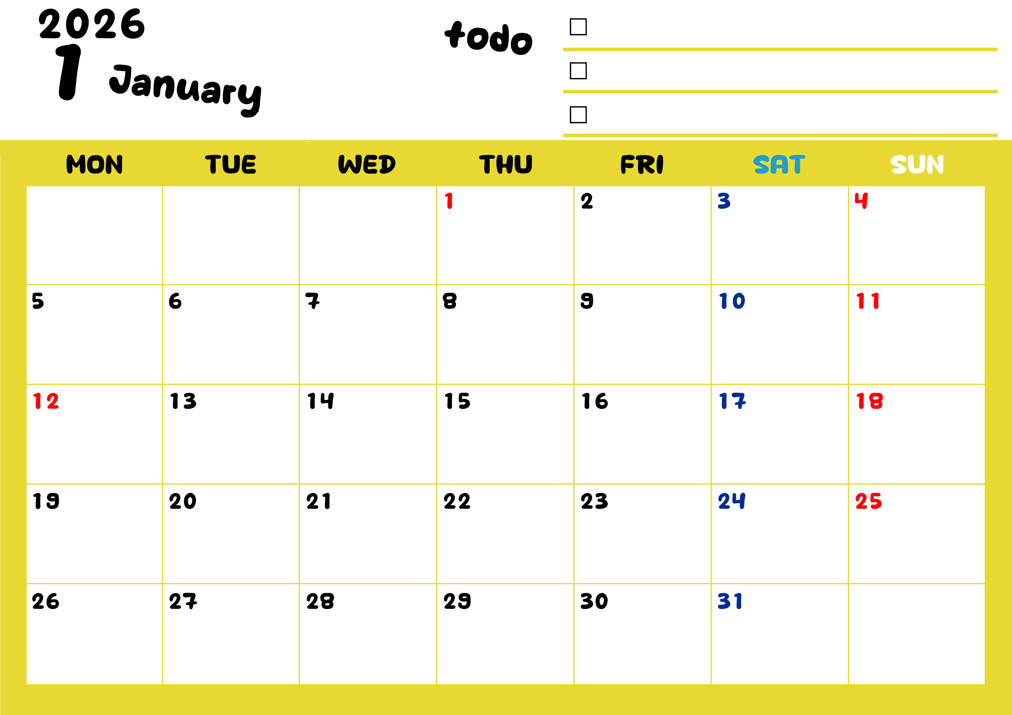 2026年1月カレンダーは横型月曜始まりです。黄色がメインカラーで継続して使いやすいToDoリストつきです。ダウンロードは無料にて行えます。(2026-01400101)