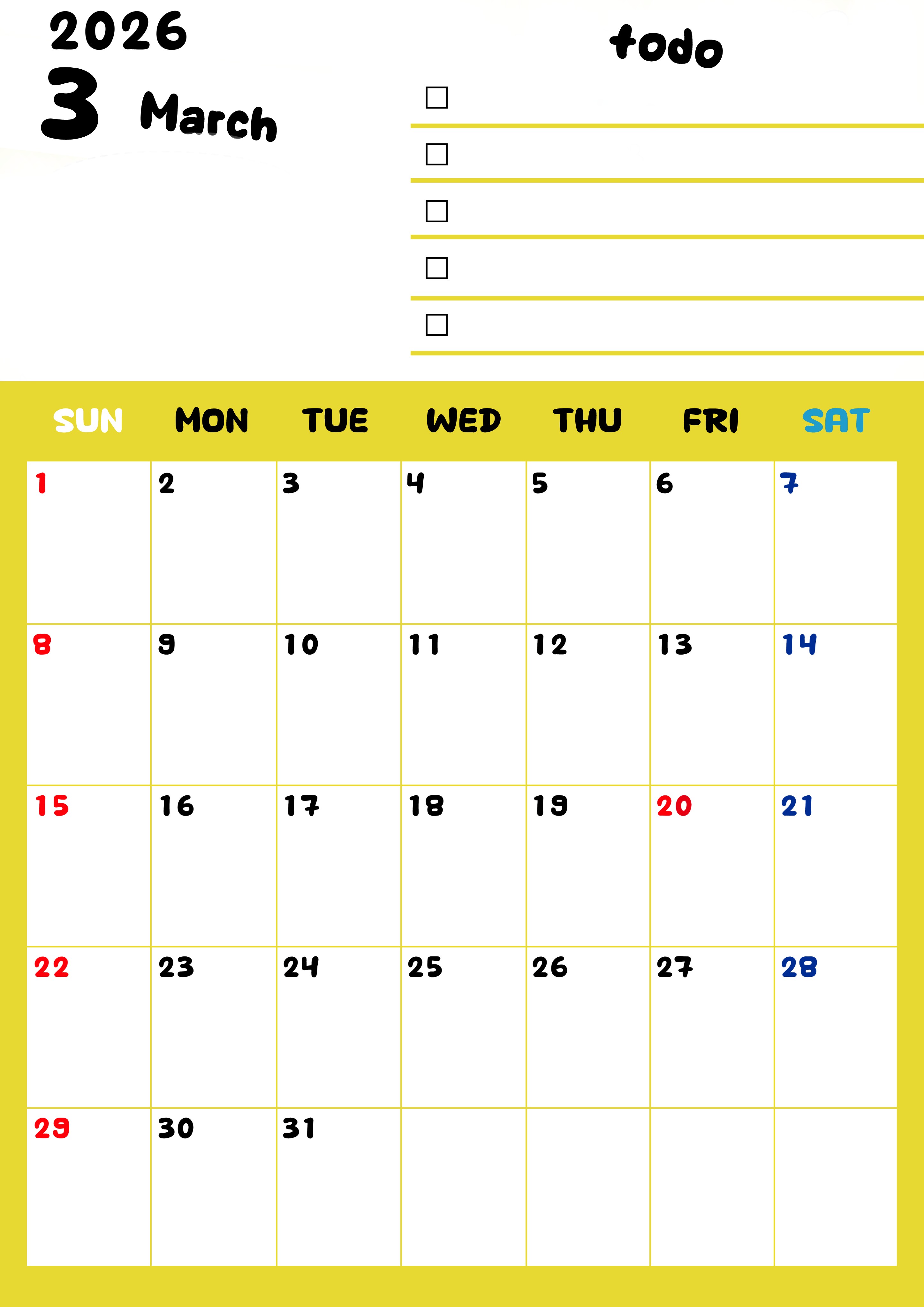 2026年・無料のカレンダーテンプレート 2026年3月カレンダーは縦型日曜始まり♪黄色がメインカラーで継続して使いやすいToDoリストつき♪(2026-01400310) 素材状デザイン王 2025年4月12日 2026年3月カレンダーは縦型日曜始まりです。黄色がメインカラーで継続して使いやすいToDoリストつきです。ダウンロードは無料にて行えます。(2026-01400310) 3月 縦型のカレンダー 日曜始まり ToDoリスト カレンダーデザイン-0140