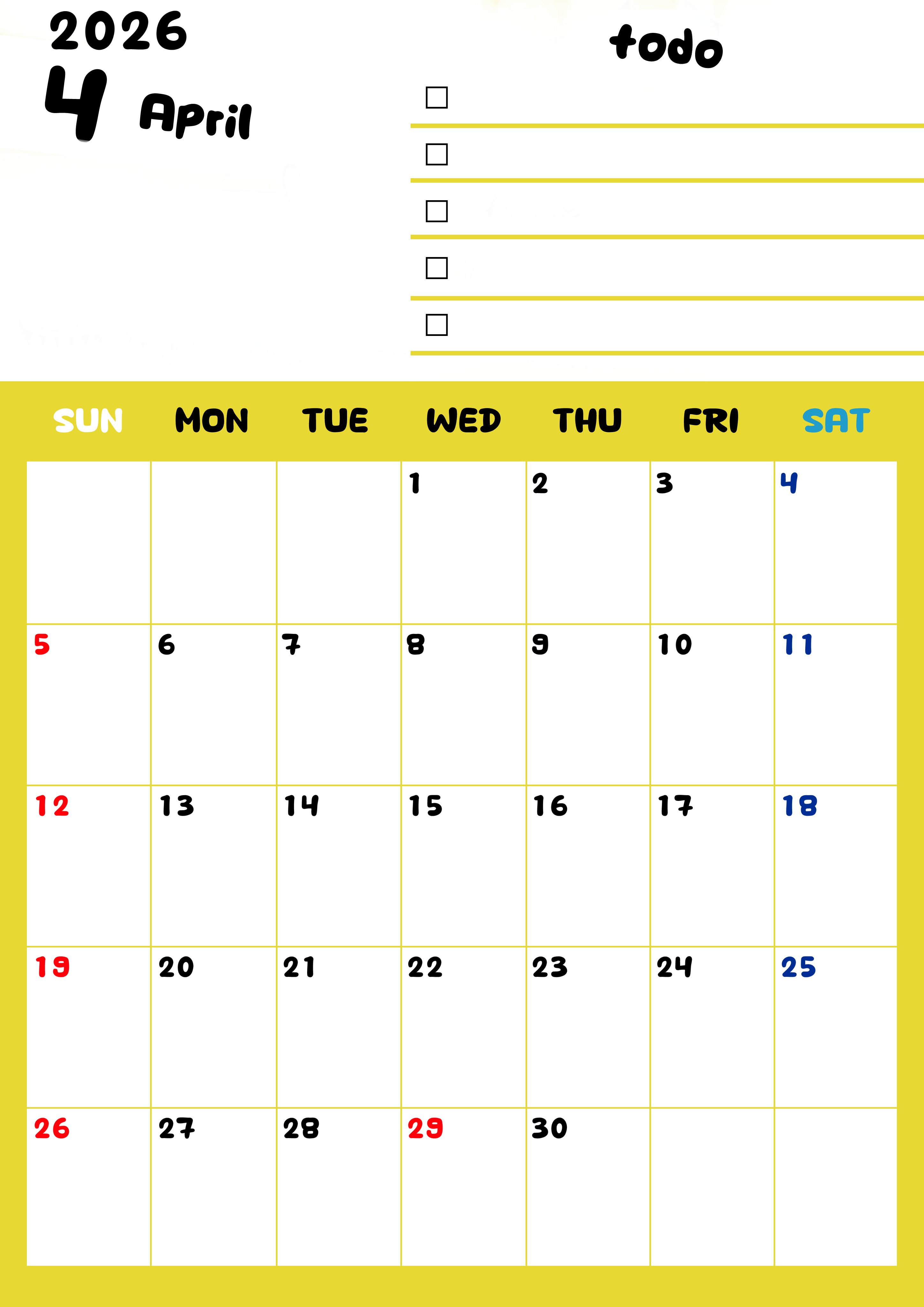 2026年・無料のカレンダーテンプレート 2026年4月カレンダーは縦型日曜始まり♪黄色がメインカラーで継続して使いやすいToDoリストつき♪(2026-01400410) 素材状デザイン王 2025年4月12日 2026年4月カレンダーは縦型日曜始まりです。黄色がメインカラーで継続して使いやすいToDoリストつきです。ダウンロードは無料にて行えます。(2026-01400410) 4月 縦型のカレンダー 日曜始まり ToDoリスト カレンダーデザイン-0140
