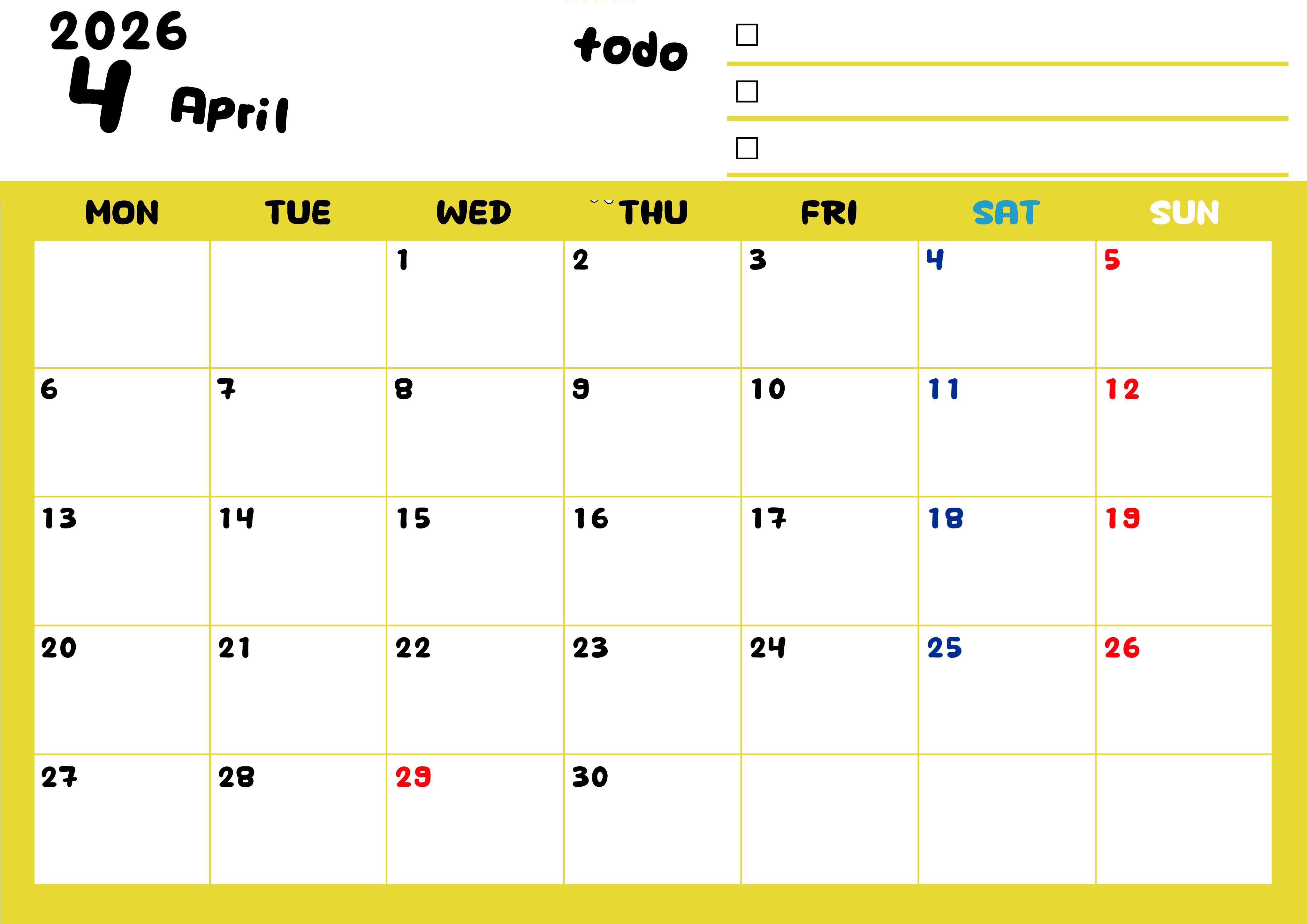 2026年・無料のカレンダーテンプレート 2026年4月カレンダーは横型月曜始まり♪黄色がメインカラーで継続して使いやすいToDoリストつき♪(2026-01400401) 素材状デザイン王 2025年4月12日 2026年4月カレンダーは横型月曜始まりです。黄色がメインカラーで継続して使いやすいToDoリストつきです。ダウンロードは無料にて行えます。(2026-01400401) 4月 横型のカレンダー 月曜始まり ToDoリスト カレンダーデザイン-0140