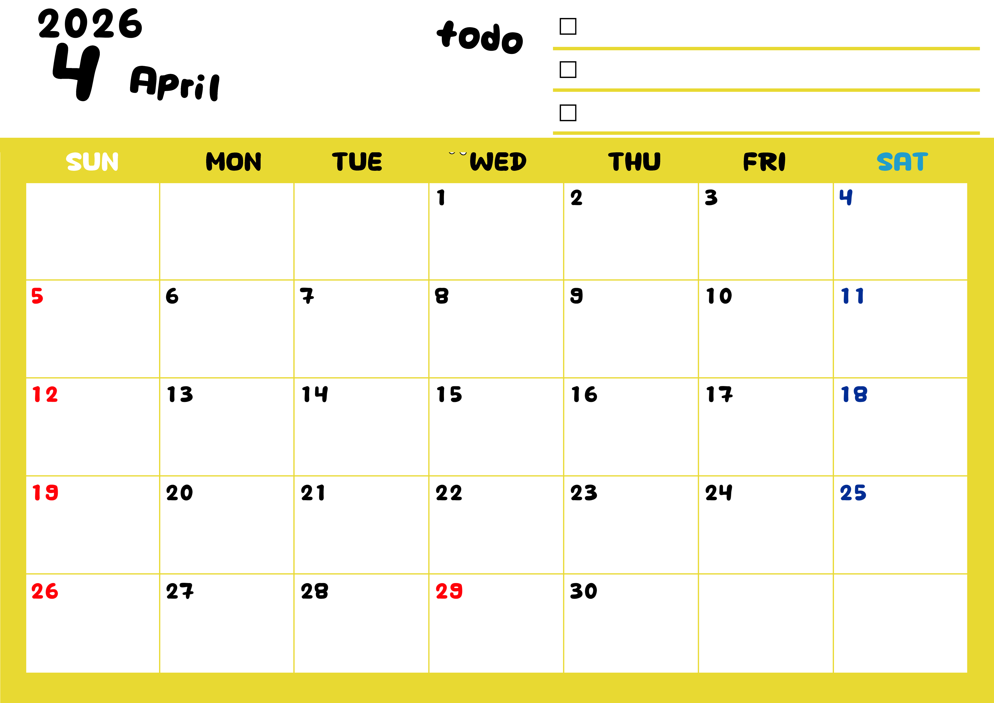 2026年4月カレンダーは横型日曜始まりです。黄色がメインカラーで継続して使いやすいToDoリストつきです。ダウンロードは無料にて行えます。(2026-01400400)