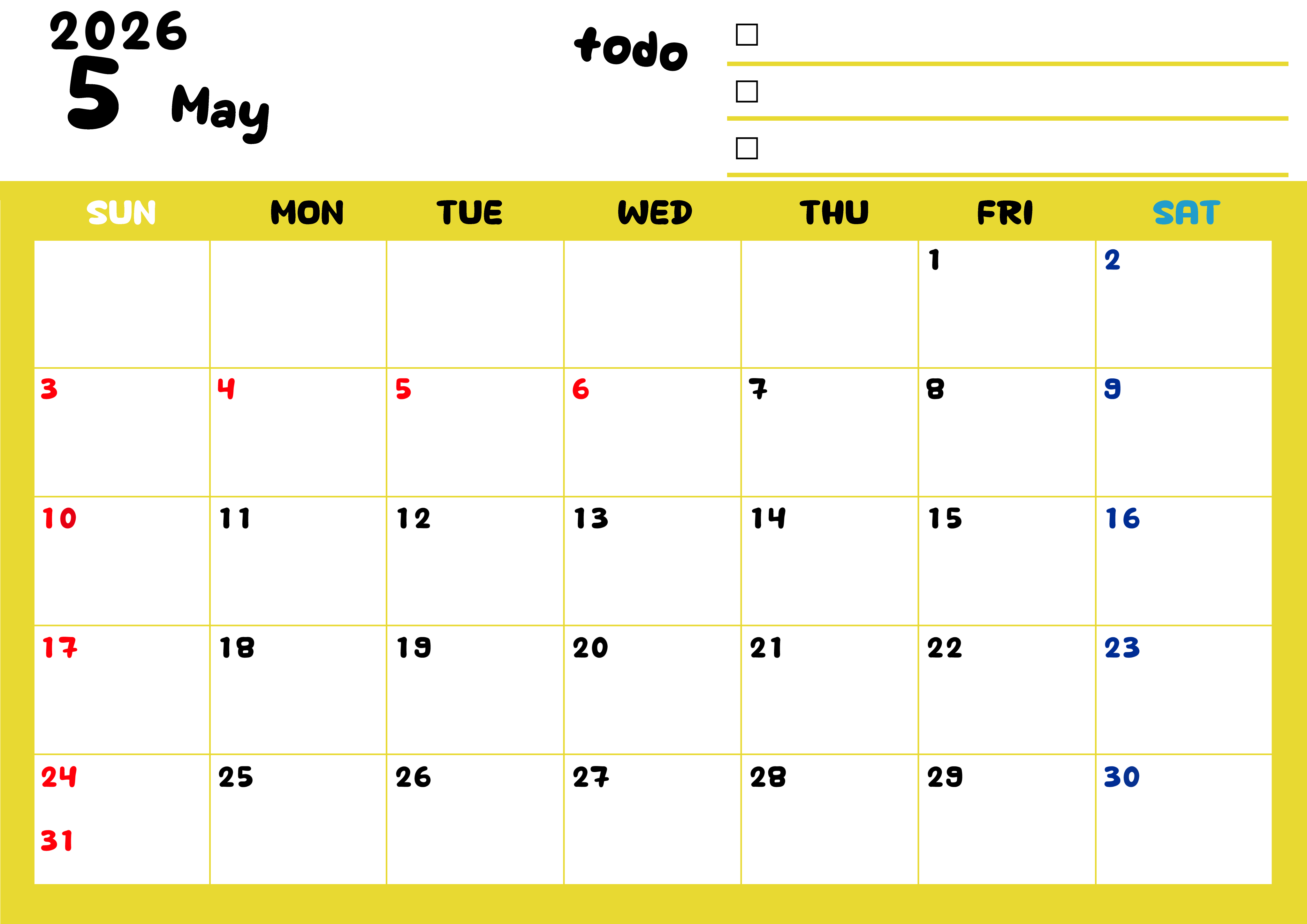 2026年5月カレンダーは横型日曜始まりです。黄色がメインカラーで継続して使いやすいToDoリストつきです。ダウンロードは無料にて行えます。(2026-01400500)