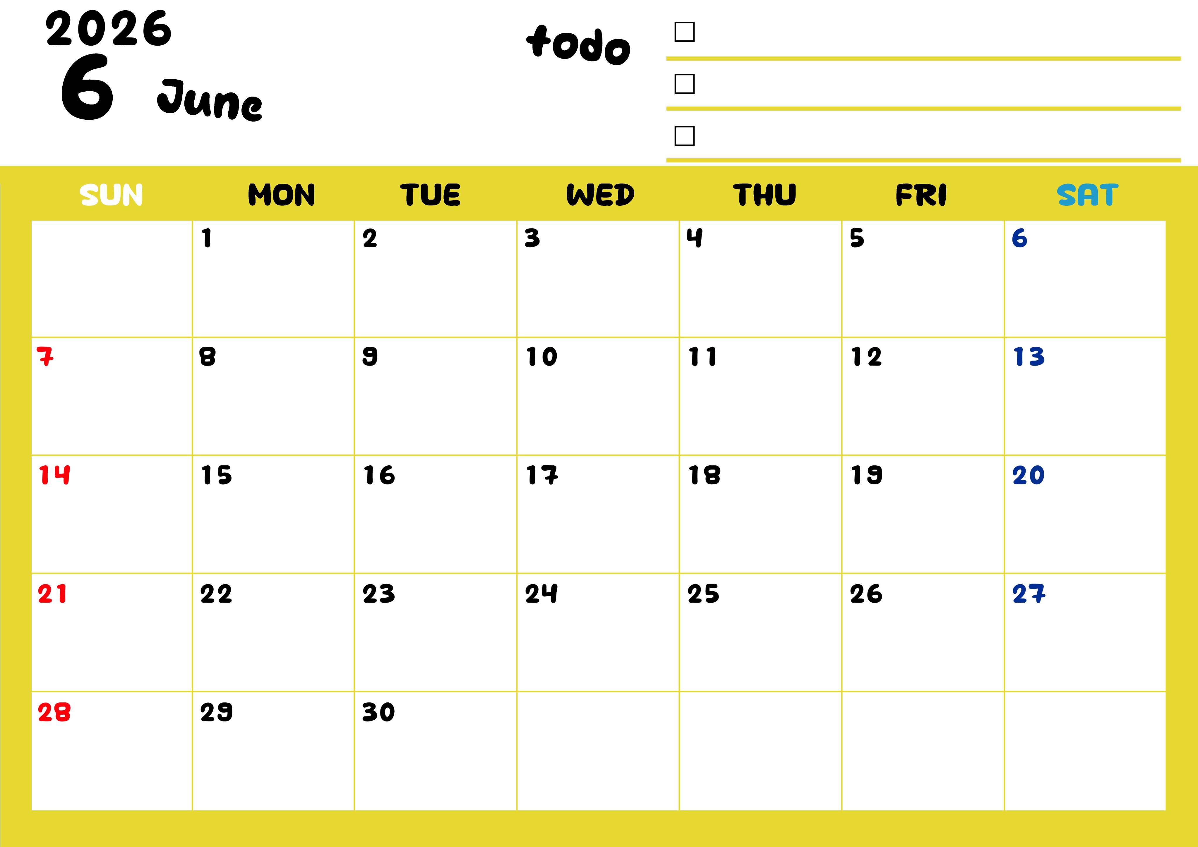 2026年6月カレンダーは横型日曜始まりです。黄色がメインカラーで継続して使いやすいToDoリストつきです。ダウンロードは無料にて行えます。(2026-01400600)
