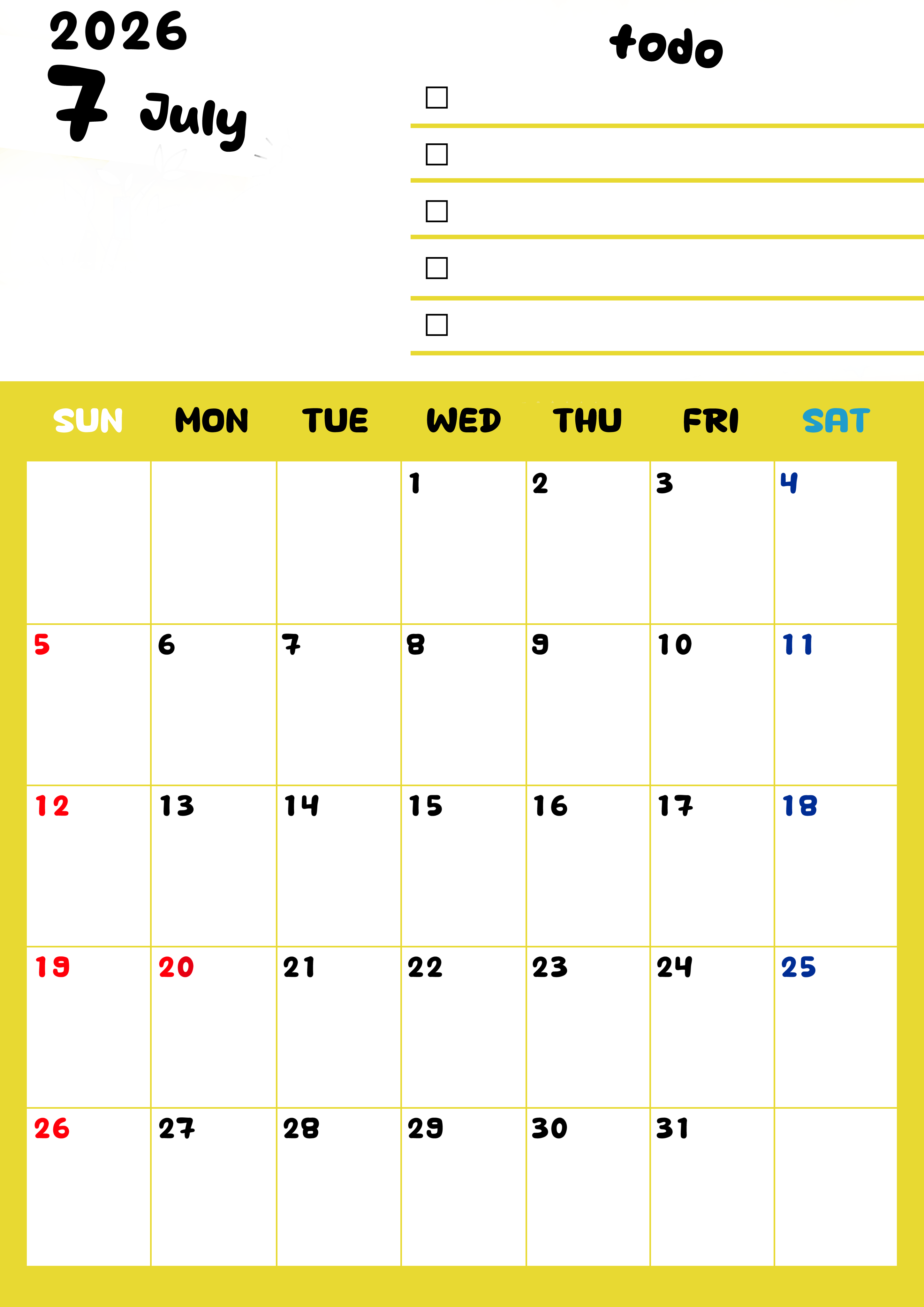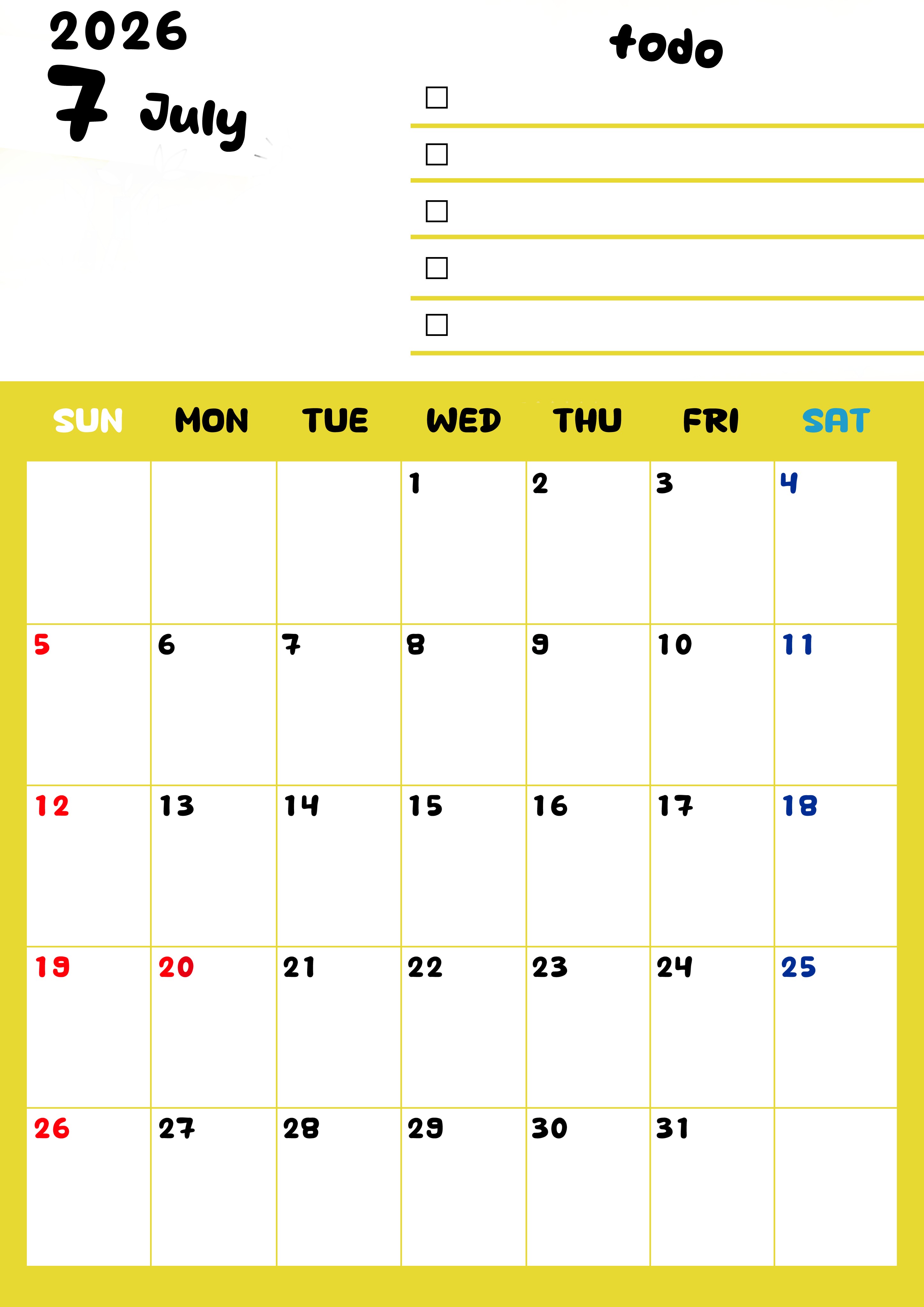 2026年・無料のカレンダーテンプレート 2026年7月カレンダーは縦型日曜始まり でベージュの花がおしゃれ:無料(2026-01400710) 素材状デザイン王 2025年4月12日 2026年7月カレンダーは縦型日曜始まりです。黄色がメインカラーで継続して使いやすいToDoリストつきです。ダウンロードは無料にて行えます。(2026-01400710) 7月 縦型のカレンダー 日曜始まり ToDoリスト カレンダーデザイン-0140