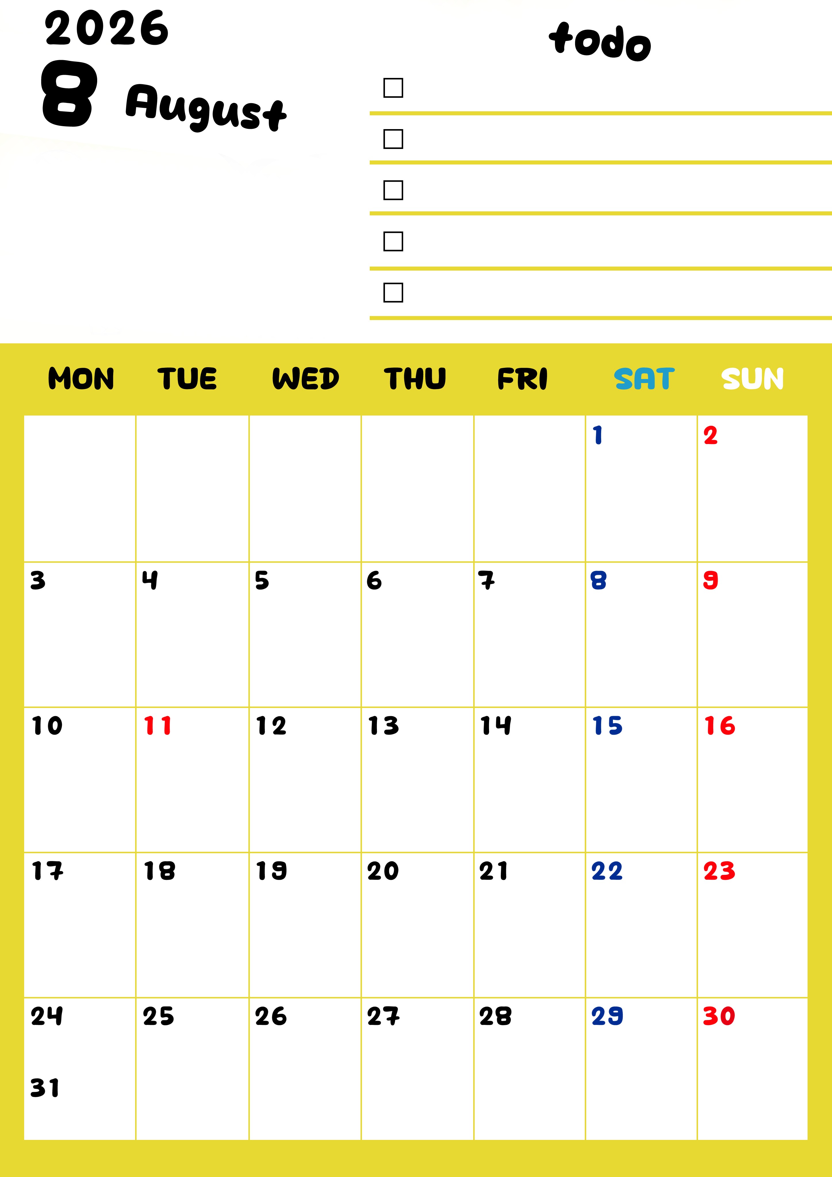 2026年・無料のカレンダーテンプレート 2026年8月カレンダーは縦型月曜始まり♪黄色がメインカラーで継続して使いやすいToDoリストつき♪(2026-01400811) 素材状デザイン王 2025年4月12日 2026年8月カレンダーは縦型月曜始まりです。黄色がメインカラーで継続して使いやすいToDoリストつきです。ダウンロードは無料にて行えます。(2026-01400811) 8月 縦型のカレンダー 月曜始まり ToDoリスト カレンダーデザイン-0140