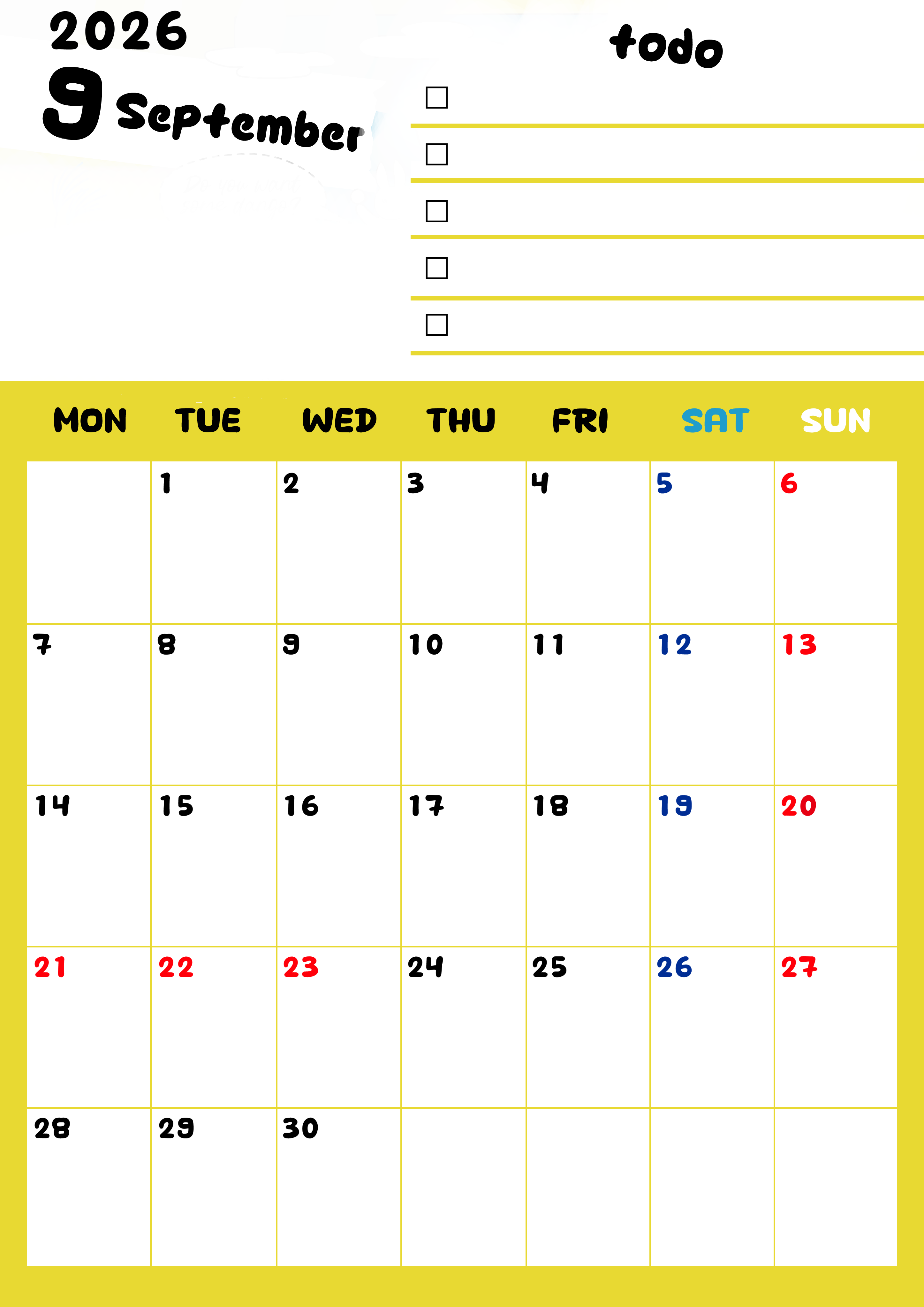 2026年・無料のカレンダーテンプレート 2026年9月カレンダーは縦型月曜始まり♪黄色がメインカラーで継続して使いやすいToDoリストつき♪(2026-01400911) 素材状デザイン王 2025年4月12日 2026年9月カレンダーは縦型月曜始まりです。黄色がメインカラーで継続して使いやすいToDoリストつきです。ダウンロードは無料にて行えます。(2026-01400911) 9月 縦型のカレンダー 月曜始まり ToDoリスト カレンダーデザイン-0140
