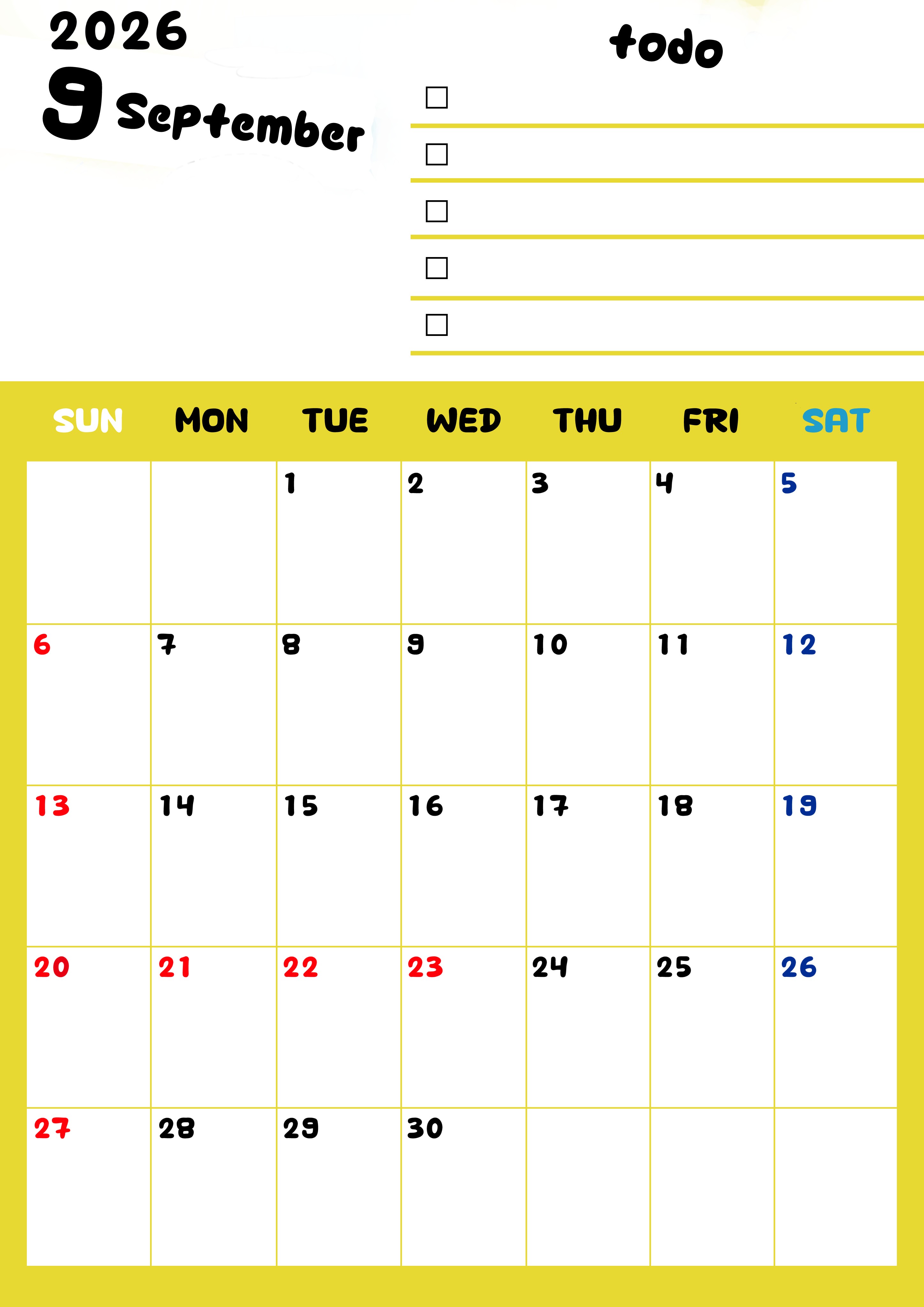 2026年・無料のカレンダーテンプレート 2026年9月カレンダーは縦型日曜始まり♪黄色がメインカラーで継続して使いやすいToDoリストつき♪(2026-01400910) 素材状デザイン王 2025年4月12日 2026年9月カレンダーは縦型日曜始まりです。黄色がメインカラーで継続して使いやすいToDoリストつきです。ダウンロードは無料にて行えます。(2026-01400910) 9月 縦型のカレンダー 日曜始まり ToDoリスト カレンダーデザイン-0140