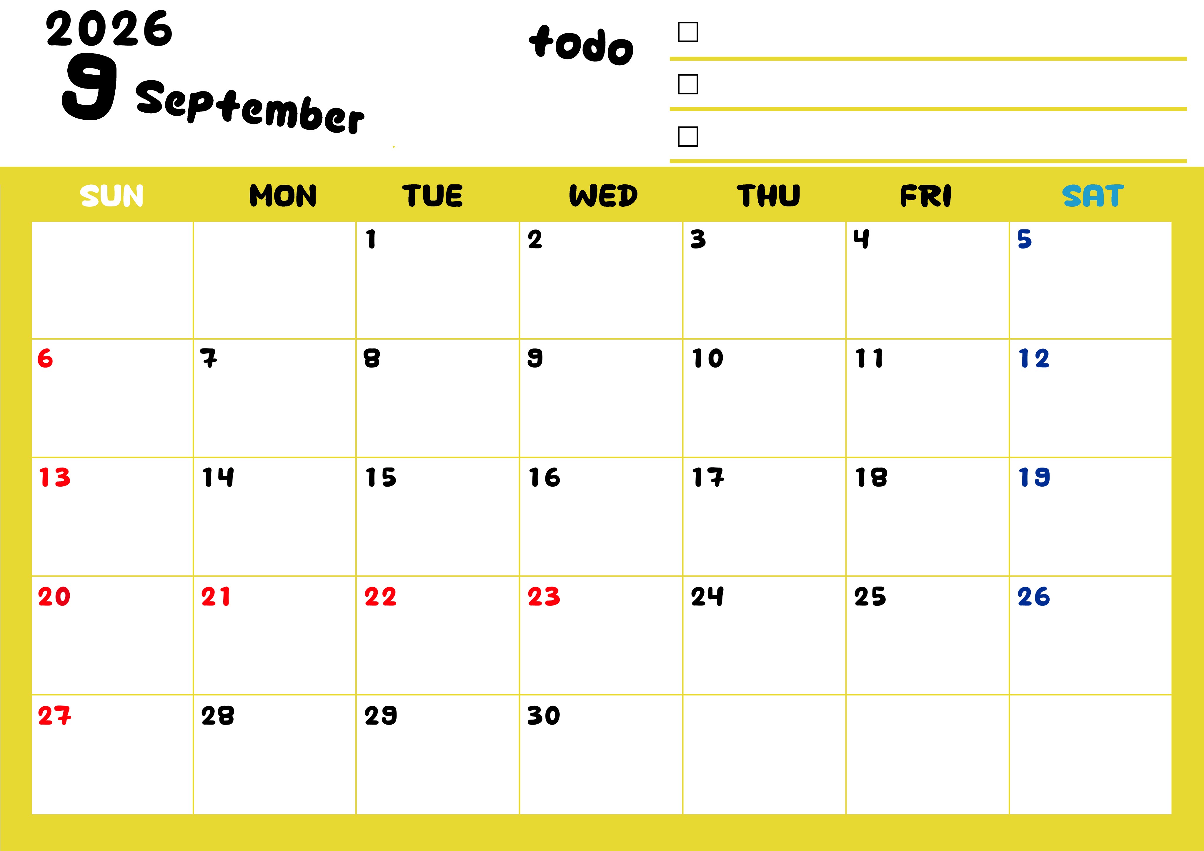 2026年・無料のカレンダーテンプレート 2026年9月カレンダーは横型日曜始まり♪黄色がメインカラーで継続して使いやすいToDoリストつき♪(2026-01400900) 素材状デザイン王 2025年4月12日 2026年9月カレンダーは横型日曜始まりです。黄色がメインカラーで継続して使いやすいToDoリストつきです。ダウンロードは無料にて行えます。(2026-01400900) 9月 横型のカレンダー 日曜始まり ToDoリスト カレンダーデザイン-0140