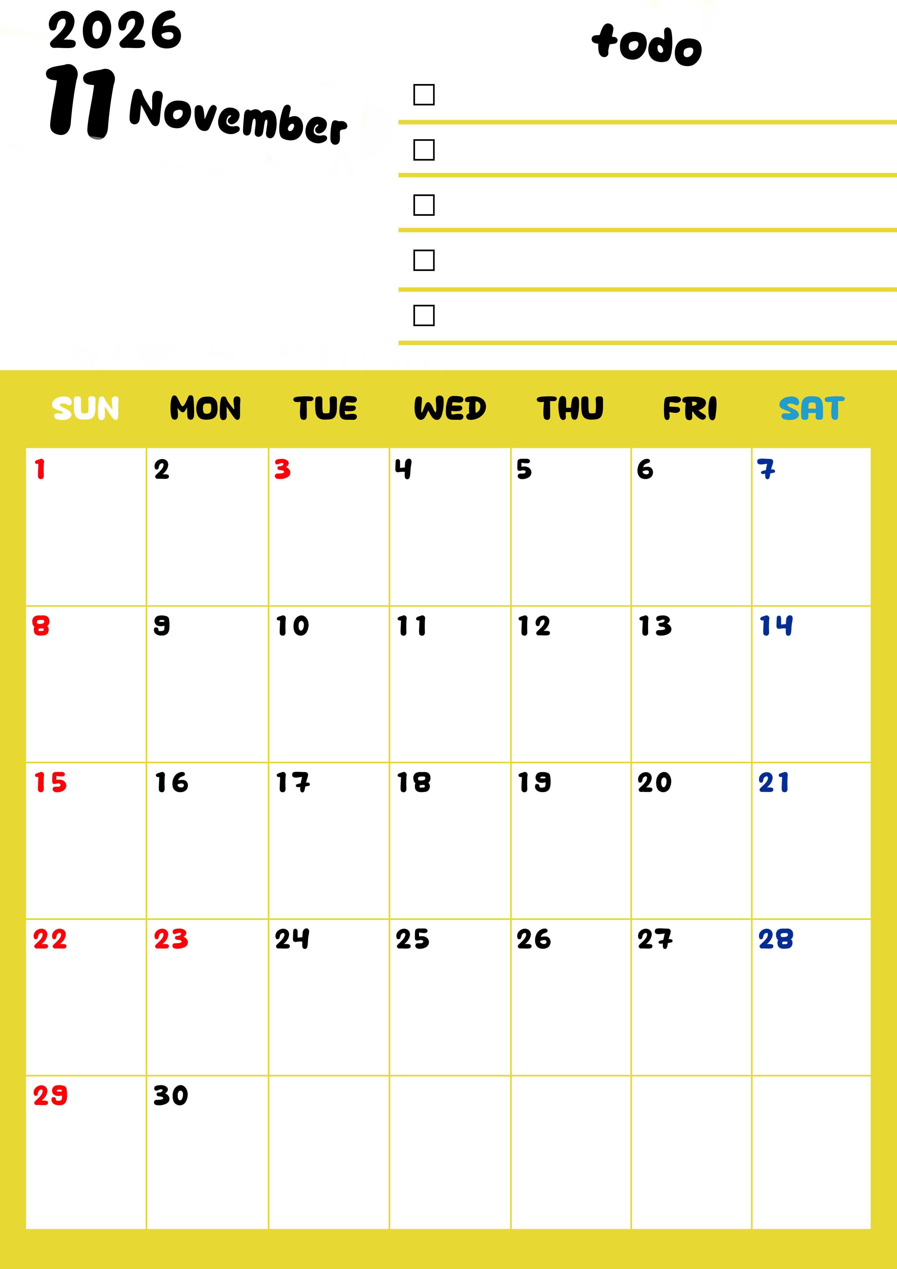 2026年11月カレンダーは縦型日曜始まりです。黄色がメインカラーで継続して使いやすいToDoリストつきです。ダウンロードは無料にて行えます。(2026-01401110)