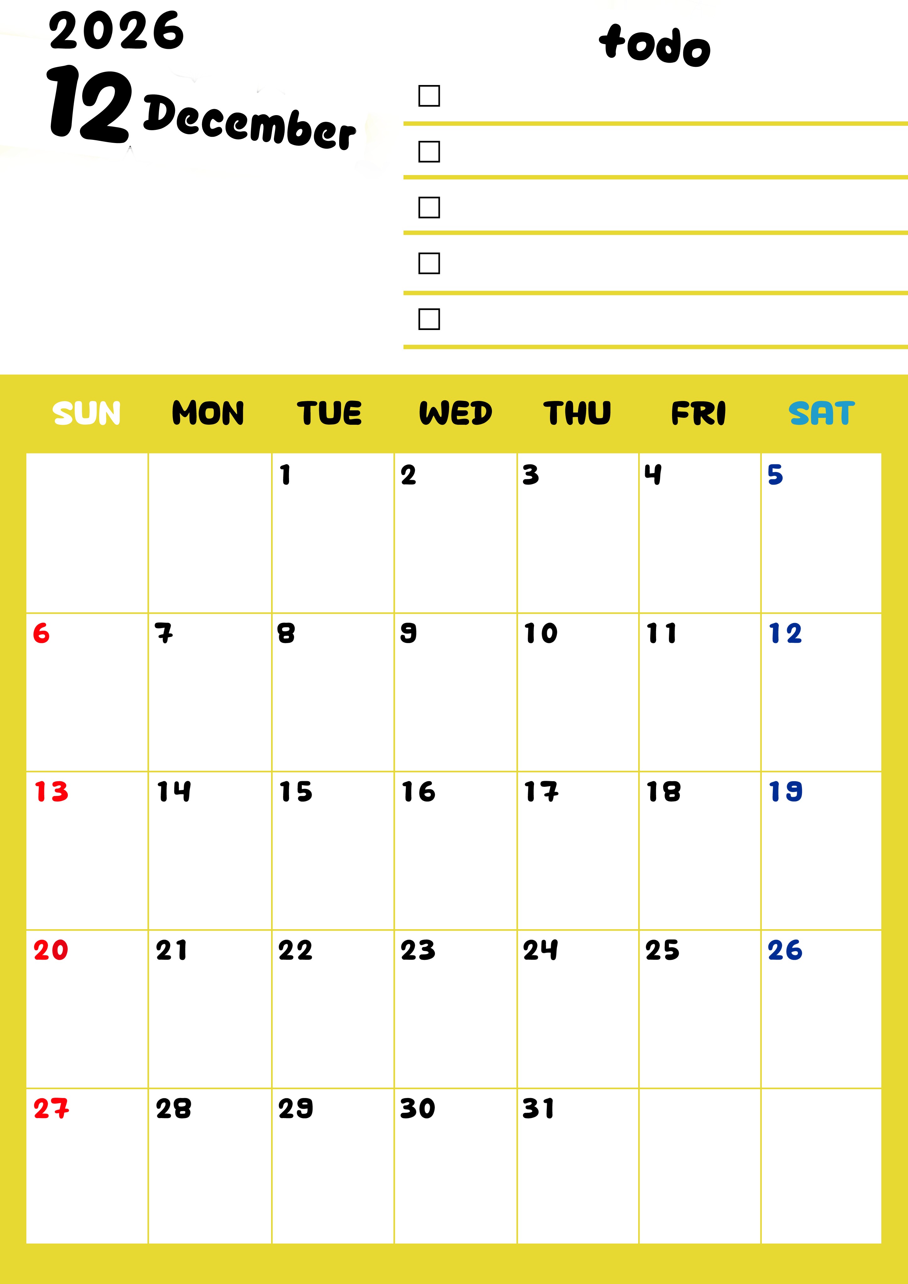 2026年12月カレンダーは縦型日曜始まりです。黄色がメインカラーで継続して使いやすいToDoリストつきです。ダウンロードは無料にて行えます。(2026-01401210)