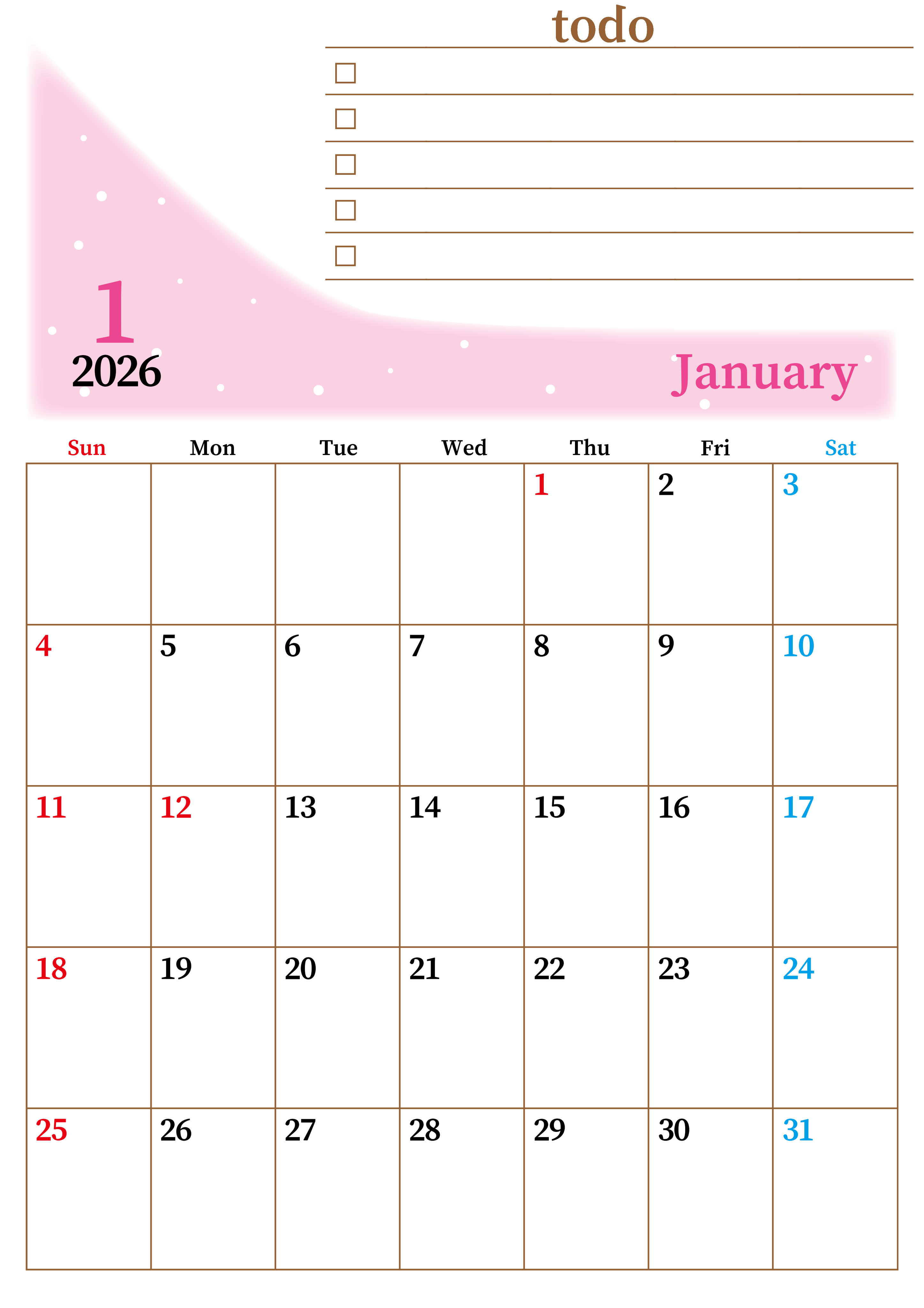 2026年・無料のカレンダーテンプレート 2026年1月カレンダーは縦型日曜始まりでToDoリストつき!毎月色違いで継続の習慣化が簡単!ダウンロード無料(2026-01410110) 素材状デザイン王 2025年4月12日 2026年1月カレンダーは縦型日曜始まりでToDoリストつきです。毎月色違いで継続の習慣化が簡単にできます。ダウンロードは無料なのでおすすめです。(2026-01410110) 1月 縦型のカレンダー 日曜始まり ToDoリスト カレンダーデザイン-0141