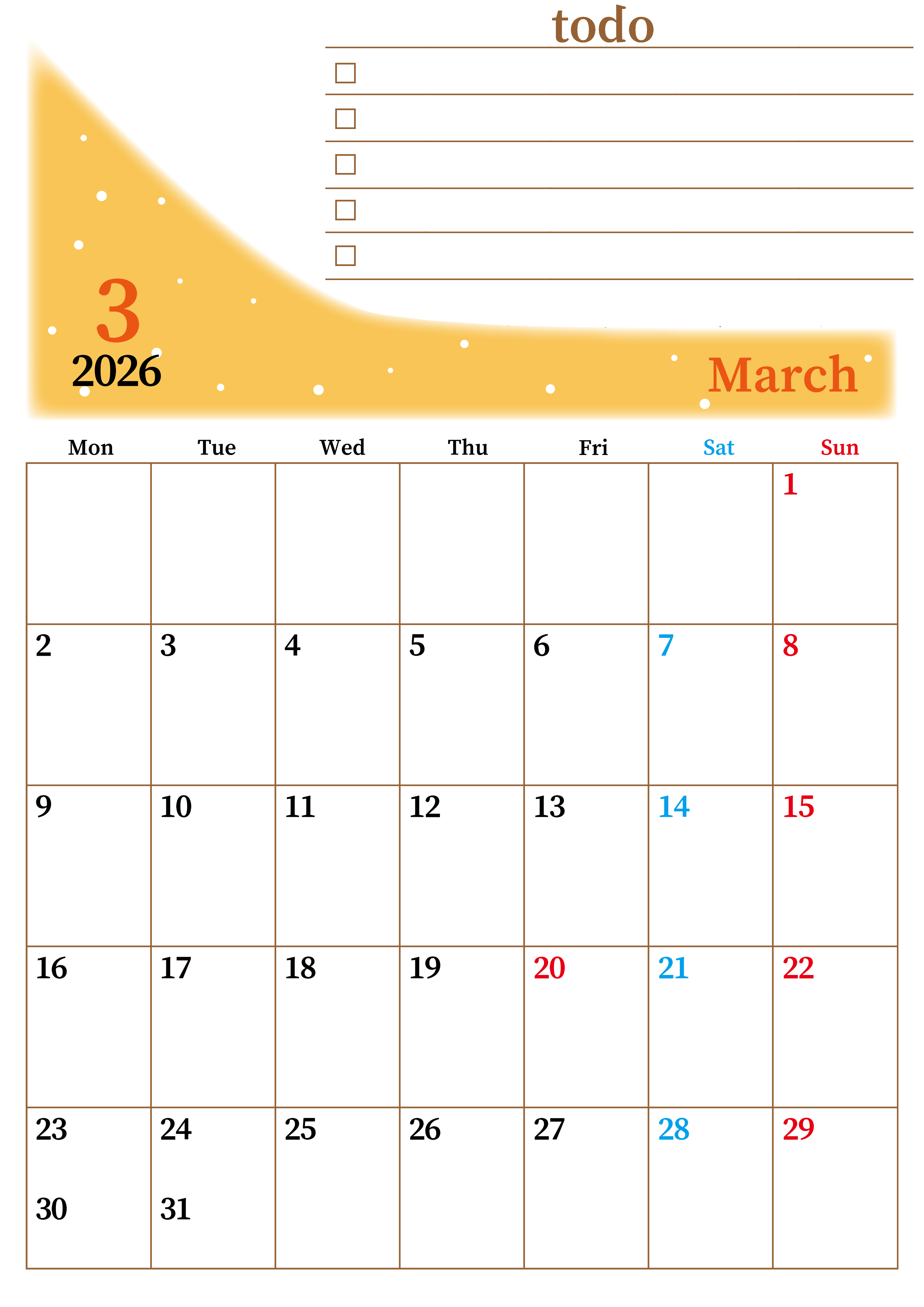 2026年3月カレンダーは縦型月曜始まりでToDoリストつきです。毎月色違いで継続の習慣化が簡単にできます。ダウンロードは無料なのでおすすめです。(2026-01410311)